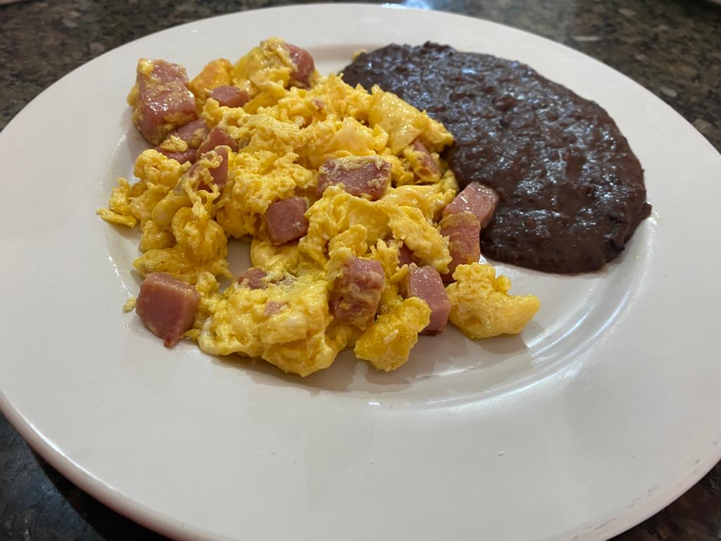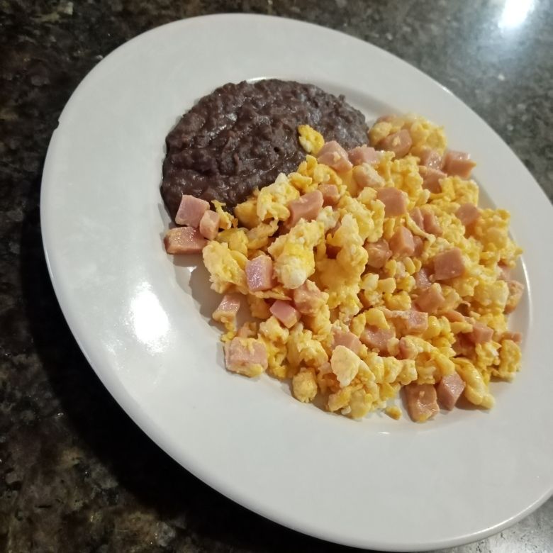 Par de huevos revueltos y guisados con tiras de jamón acompañado de frijoles