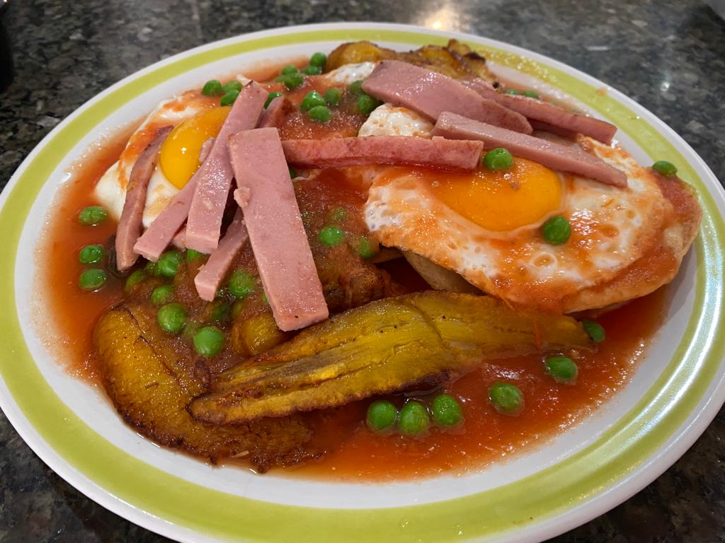 Huevos a la plancha montados sobre tortilla tostada y bañados en salsa de tomate con chícharos, plátanos fritos y jamon