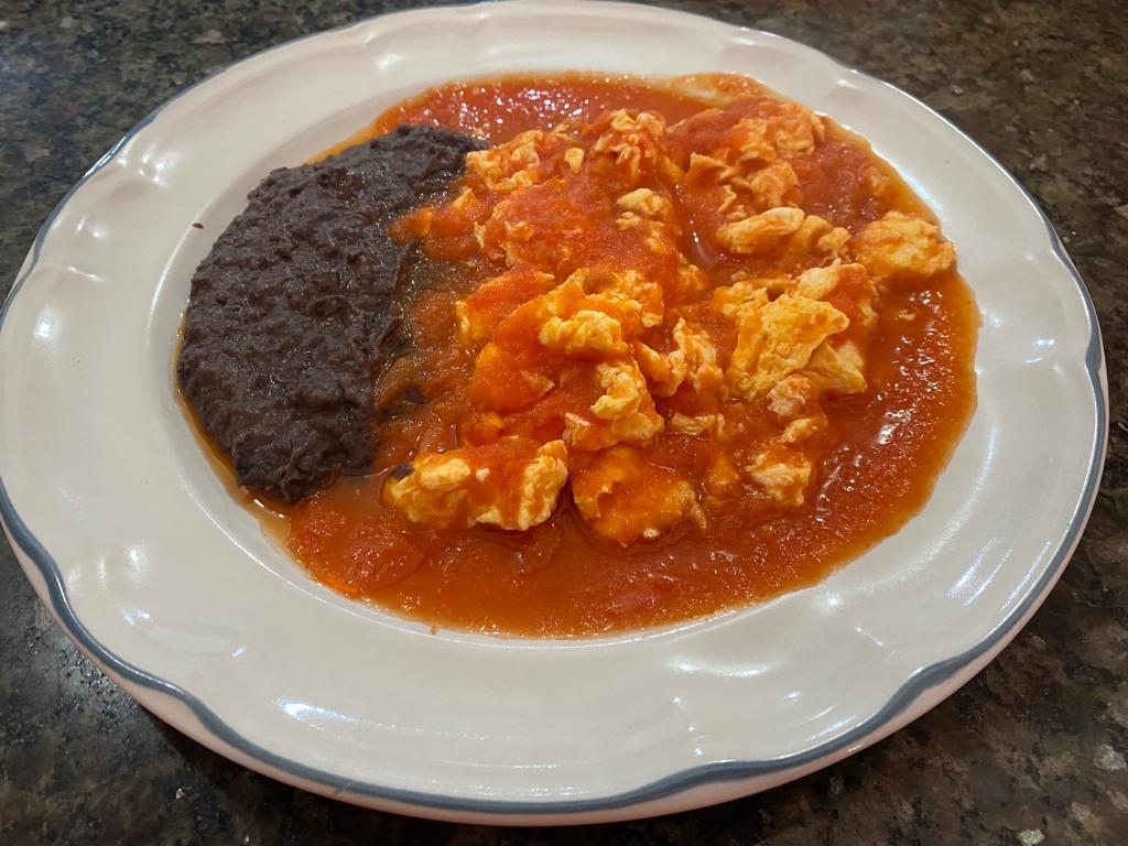 Par de huevos revueltos ahogados en salsa roja picante acompañados con frijoles
