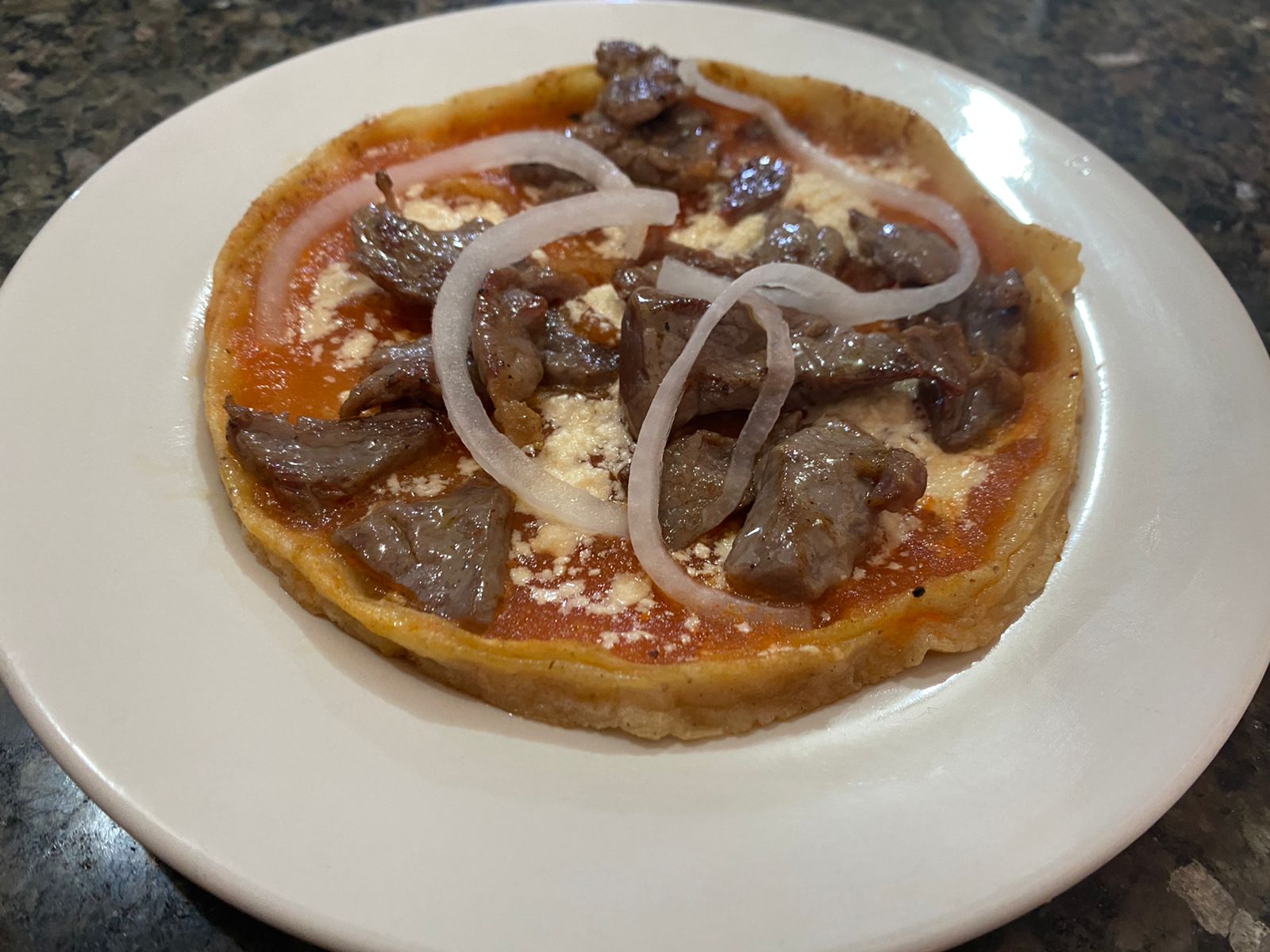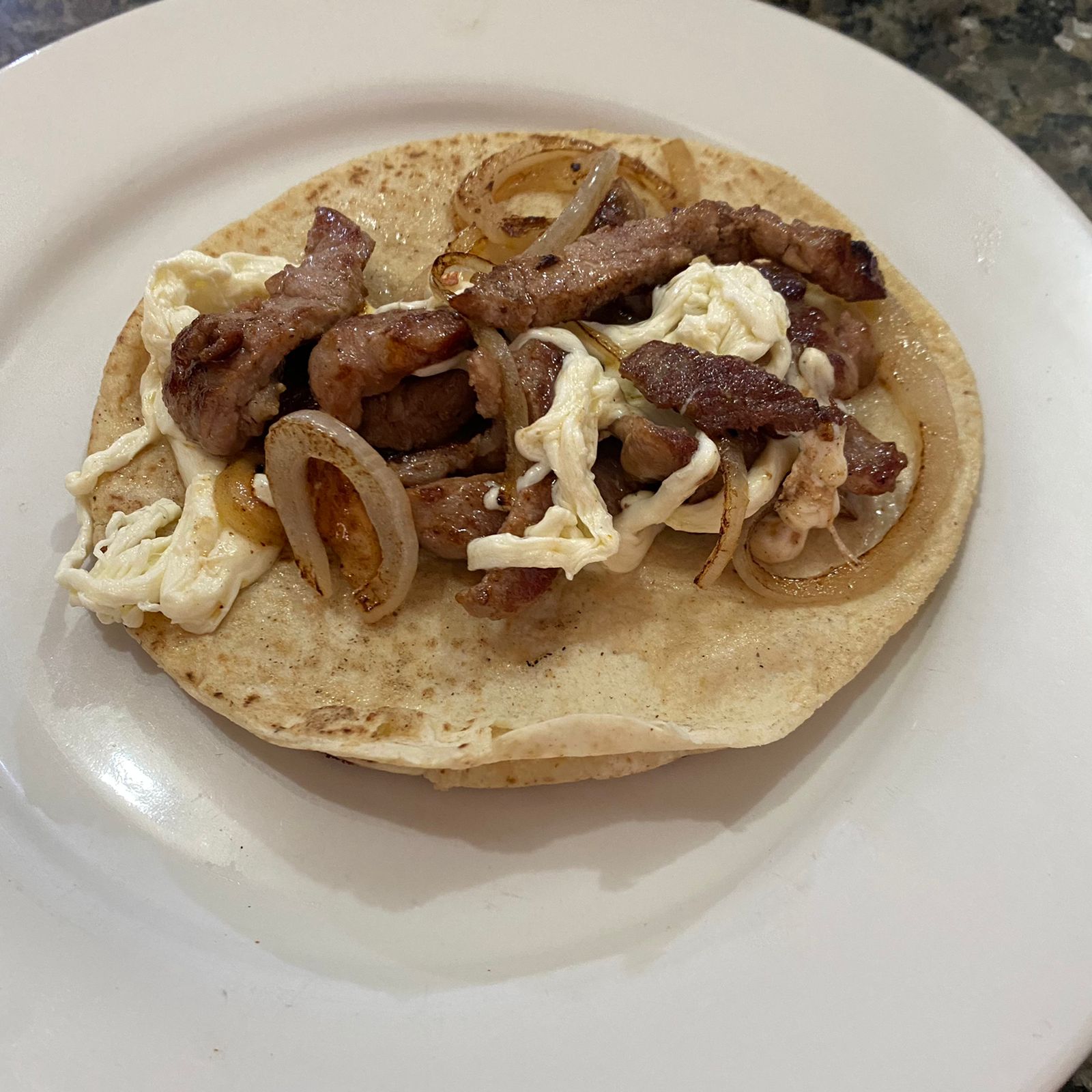 Tiras de Bisteck a la plancha guisada y salteada con cebolla montada sobre una tortilla