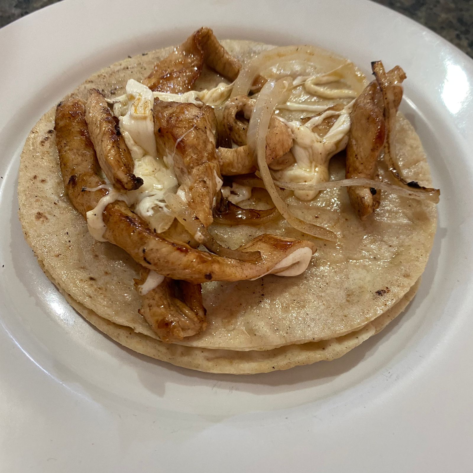 Tiras de Pechuga de pollo marinadas con inglesa a la plancha montadas en una tortilla y cebolla salteada