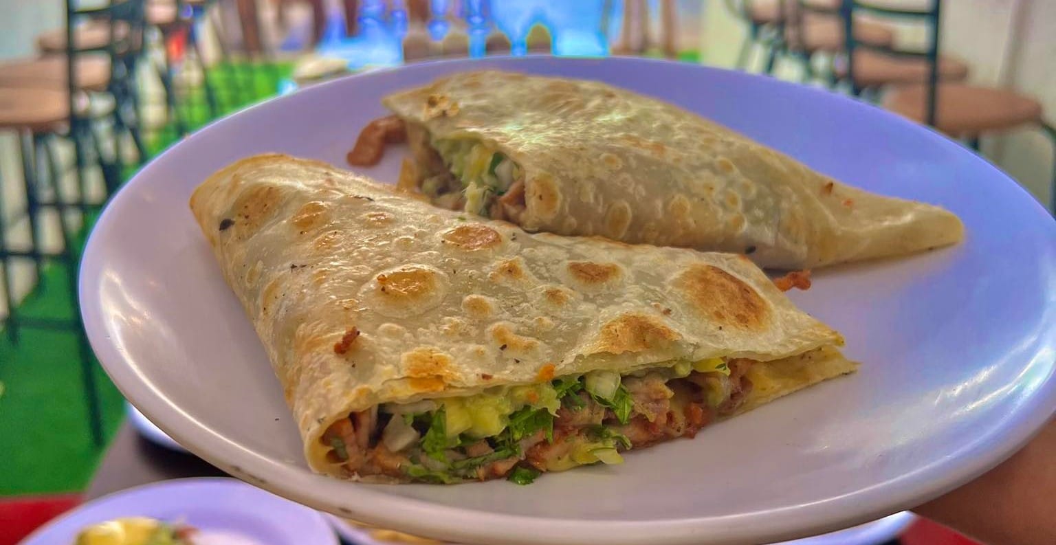 Tortilla de harina, queso manchego, cebolla, pimiento, chile poblano, champiñones, calabaza y guacamole.