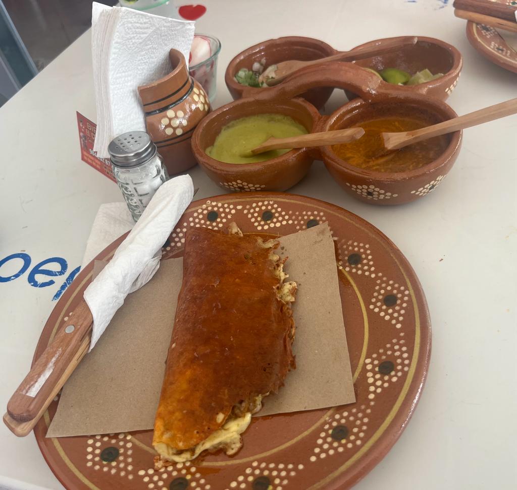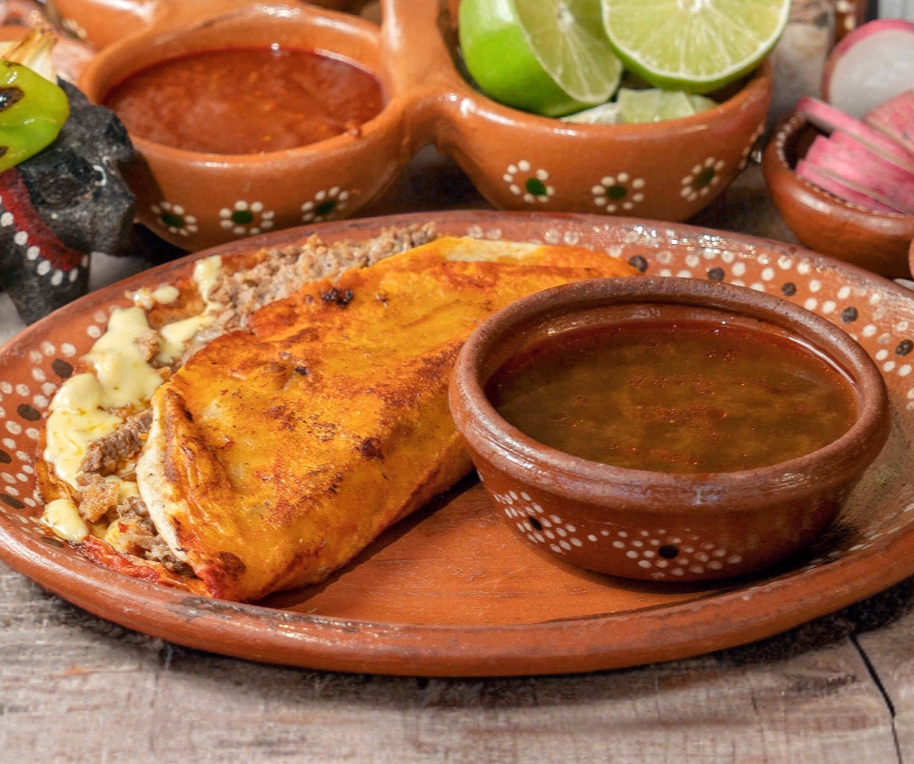 Tortilla de harina grande enchilada, queso y carne. Incluye 1/4 de consomé sin carne. Acompañado de salsas de la casa y verduras.