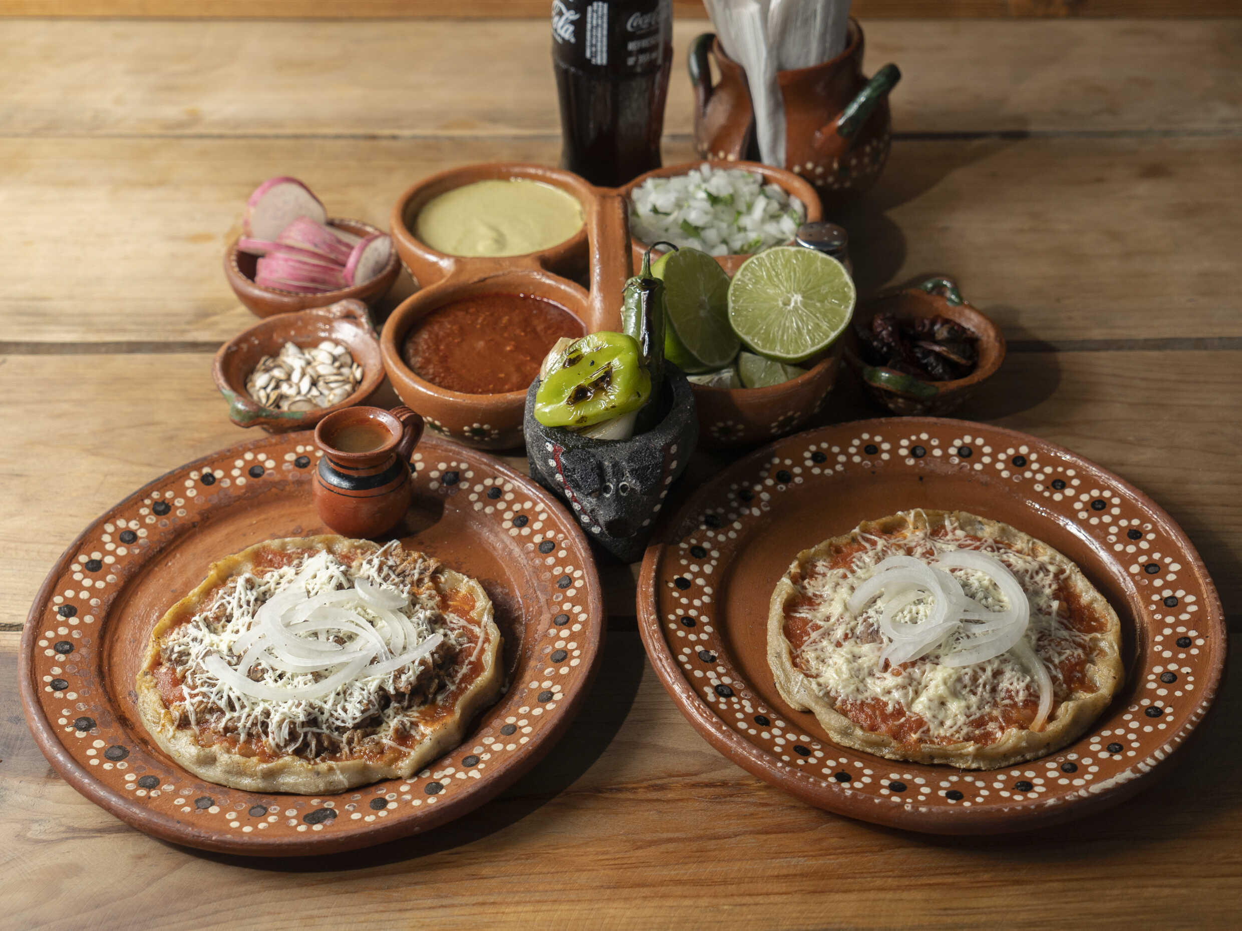 Tortilla gruesa de maíz con bordes enchilada, salsa de jitomate y un toque de chipotle como base, carne, queso y cebolla.