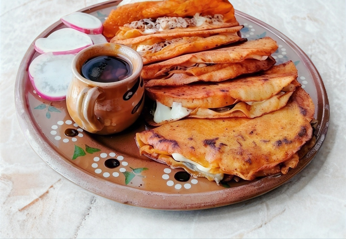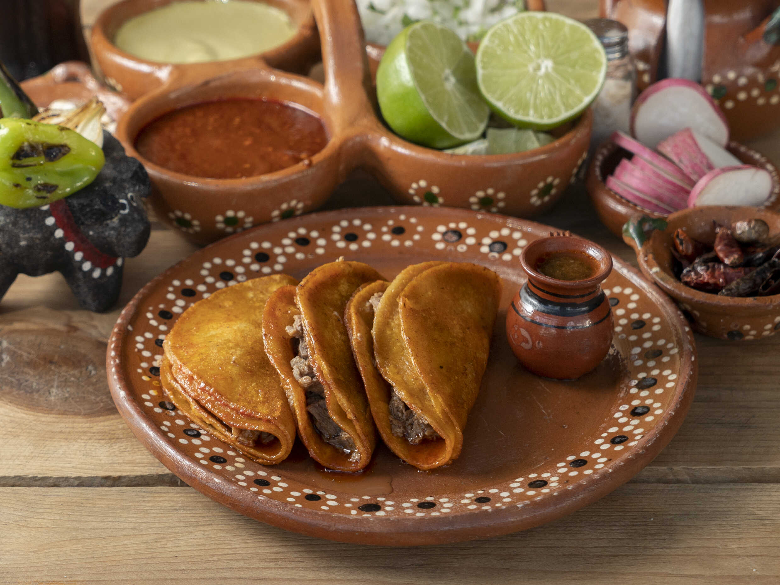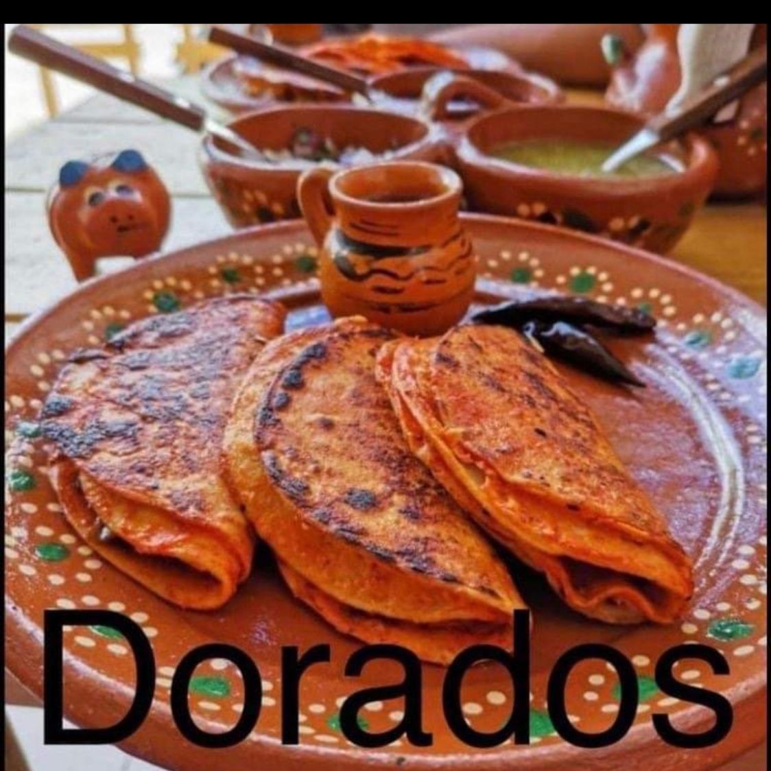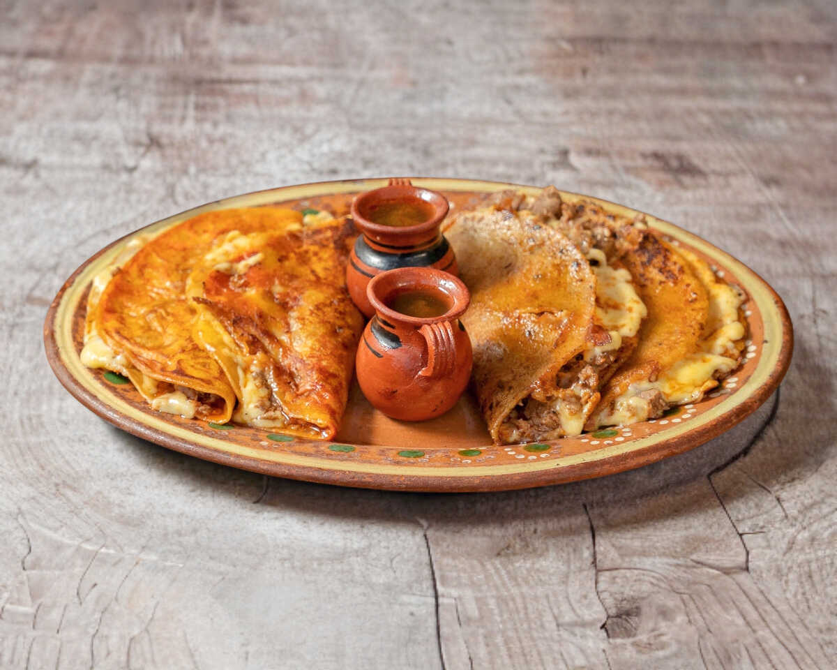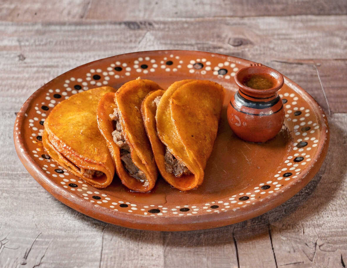 Tortilla de maíz artesanal hecha a mano, enchilada y dorada, queso, carne.
