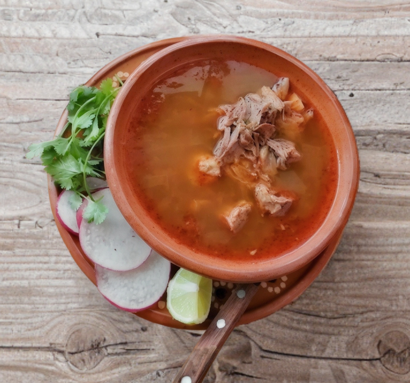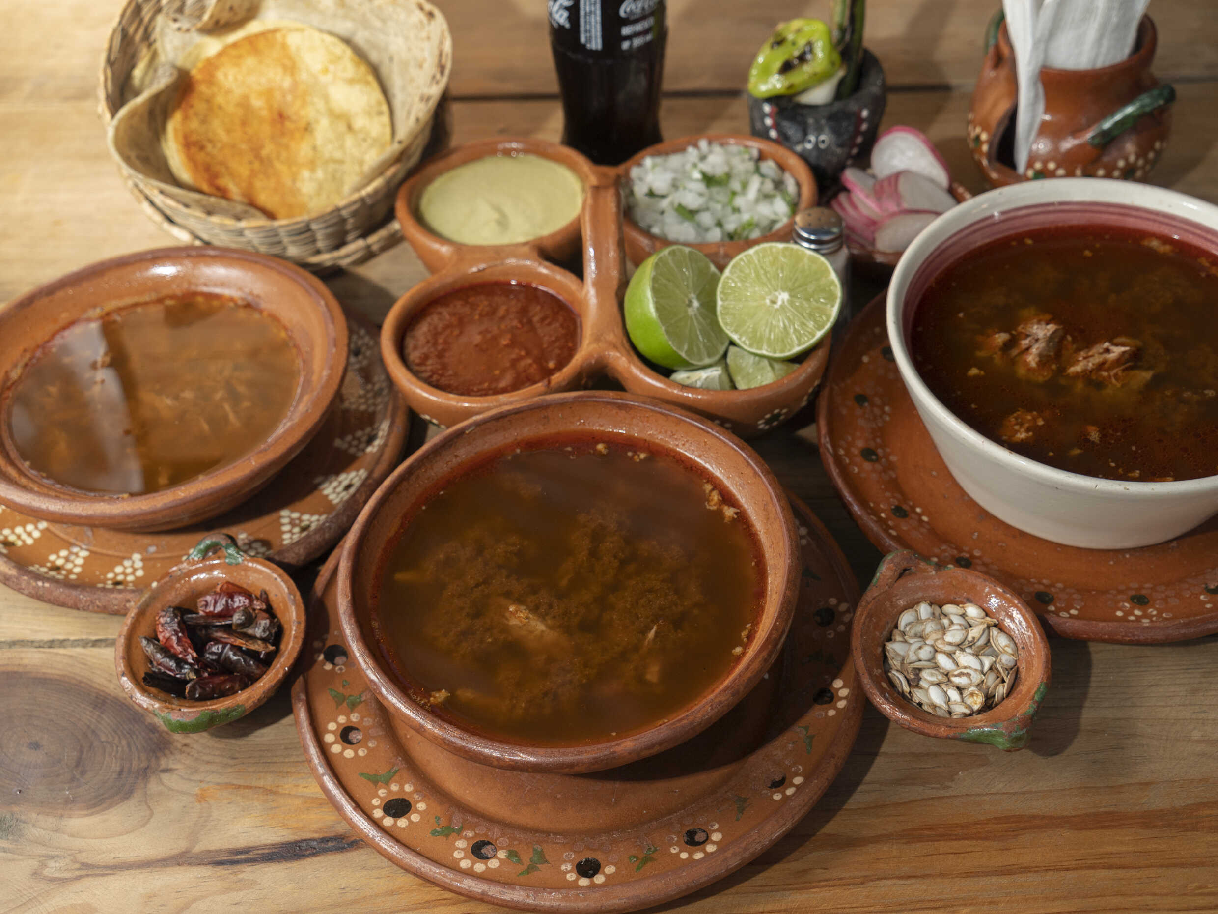 3/4 de litro de consomé con carne, 4 tortillas enchiladas 2 hechas a mano, salsas de la casa y verduras