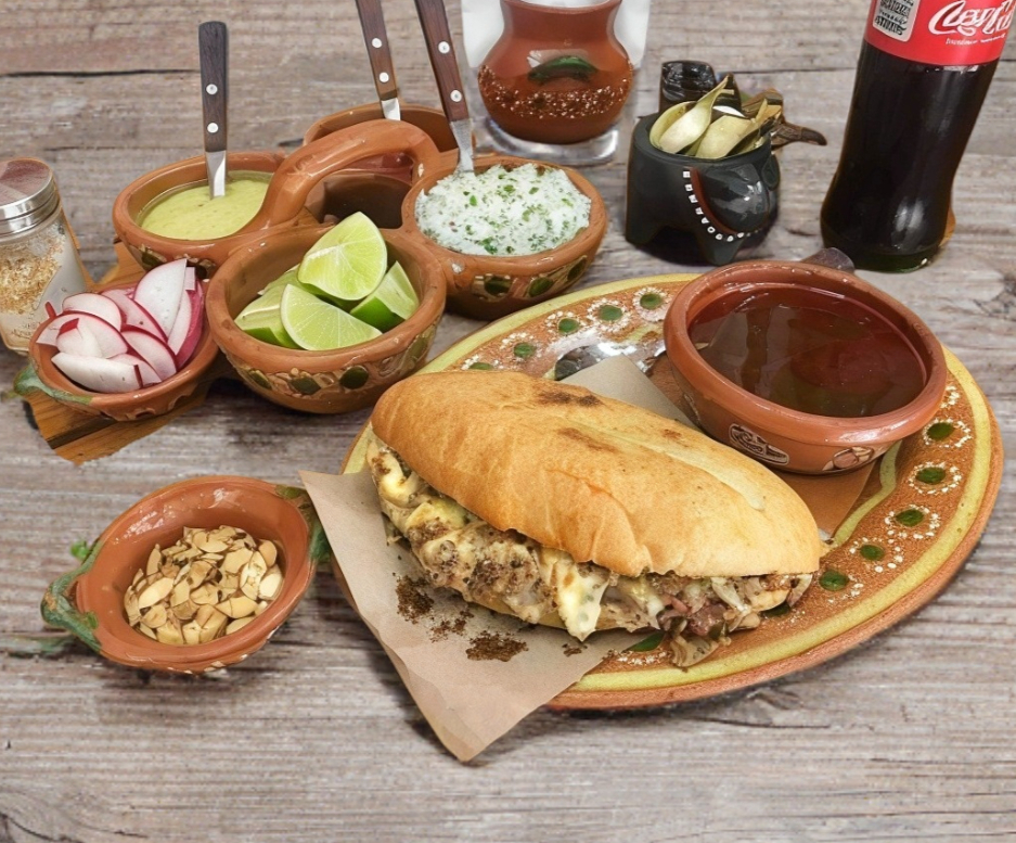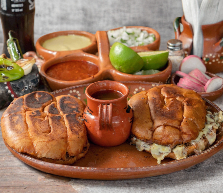 Pan con mayonesa dorado, queso y carne en su interior. Incluyen salsas, limones y complementos.