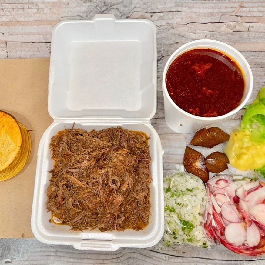 1Kg de Birria con 1 Lt de consomé sin carne, 1/2 kg de tortillas hechas a mano y enchiladas. Incluye salsas de la casa, rábano, limón y cilantro con cebolla.