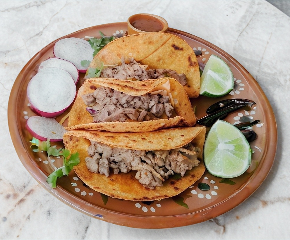 Tortilla taquera doble carne enchilada en el interior con queso. Incluye salsas de la casa y verdura.