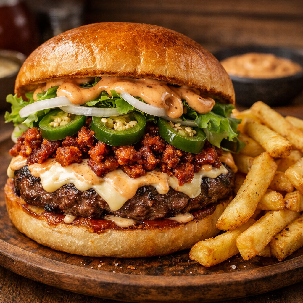 Carne de res preparada con la receta de la casa, quesillo, chorizo, jalapeño, lechuga, cebolla y aderezo de chipotle. Papitas fritas caseras.