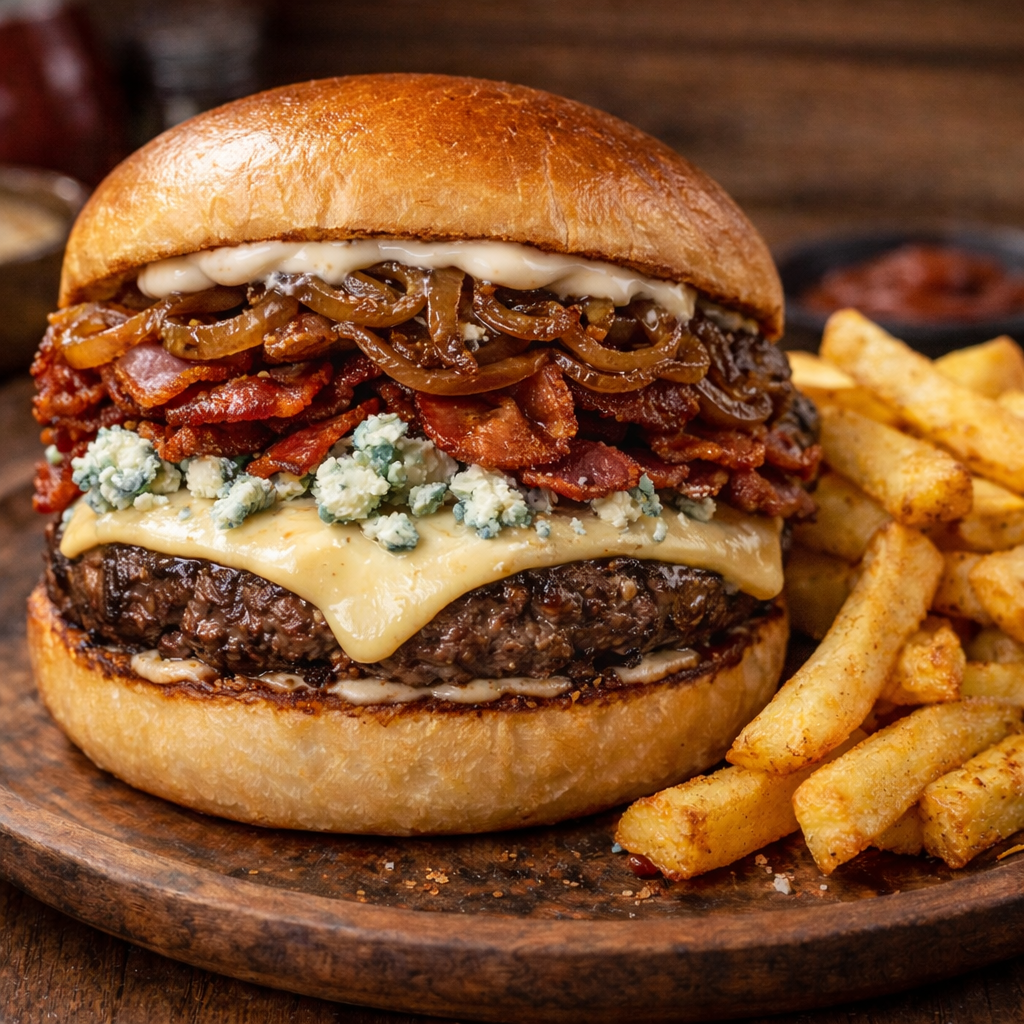 Carne de res preparada con la receta de la casa, aderezada con queso azul, queso menonita, tocino, cebolla caramelizada y mayonesa. Papitas fritas caseras.