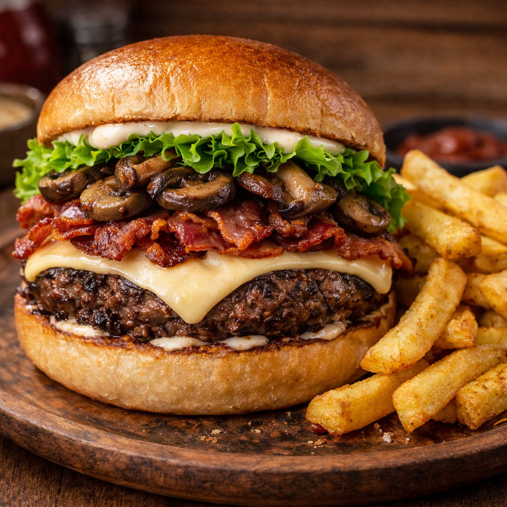 Carne de res preparada con la receta de la casa, hongos portobello baby salteados, tocino, queso menonita, lechuga y mayonesa. Papitas fritas caseras.