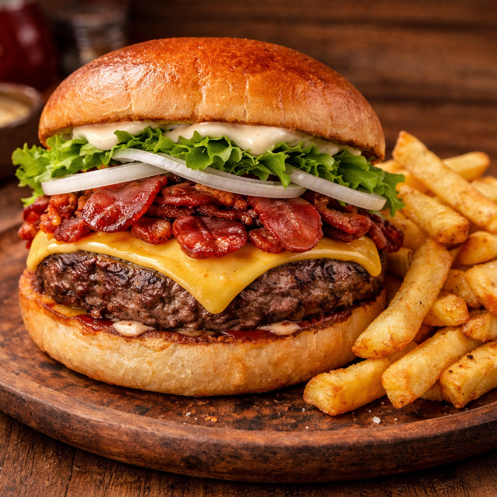 Carne de res preparada con la receta de la casa, queso americano, tocino, mayonesa, lechuga y cebolla. Papitas fritas caseras.