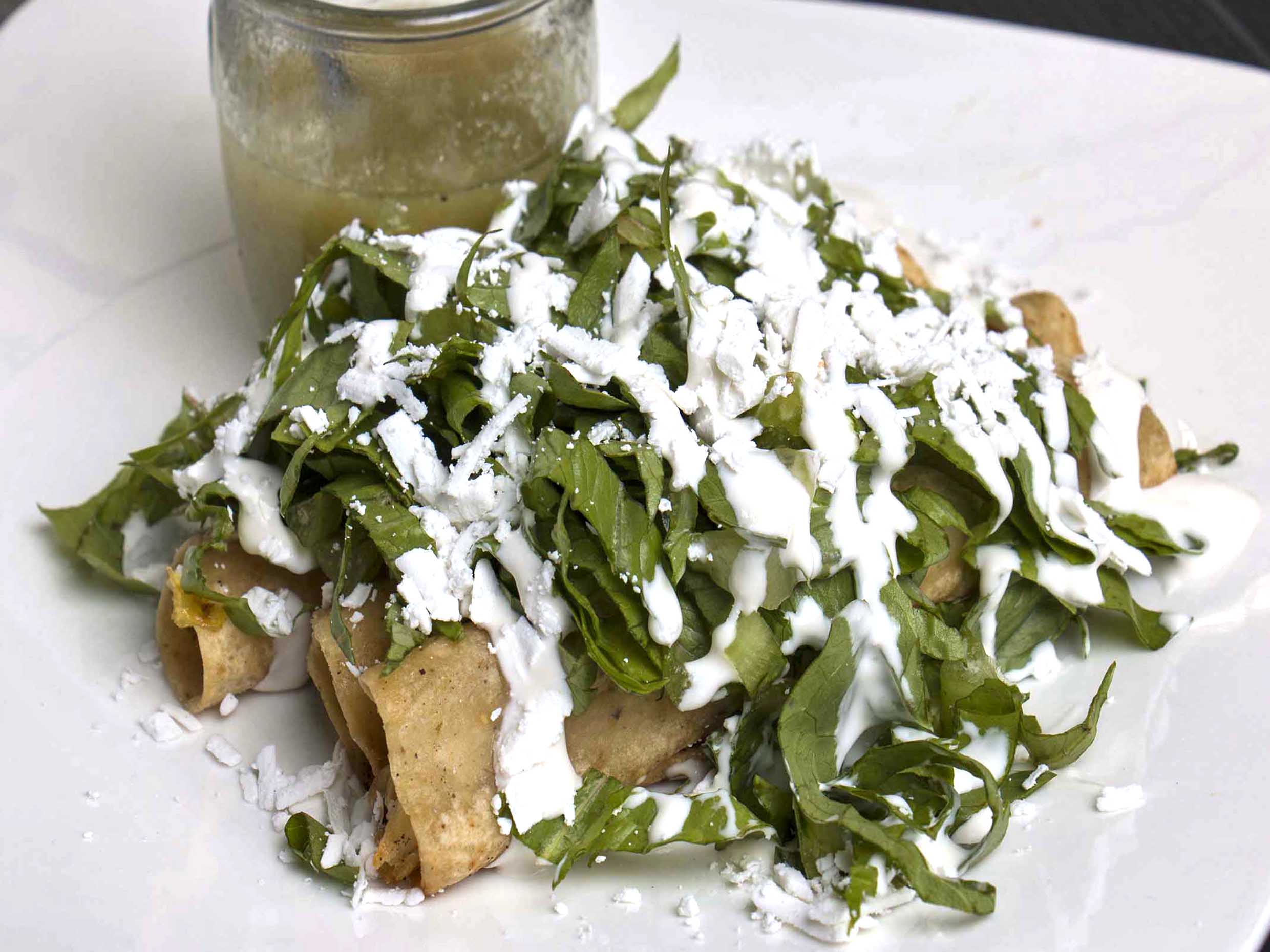 Verdes, rojos o mayas. Totopos bañados en salsa roja, verde, suiza o roja de recodo y habanera, acompañados de pollo o huevos fritos, crema y queso.