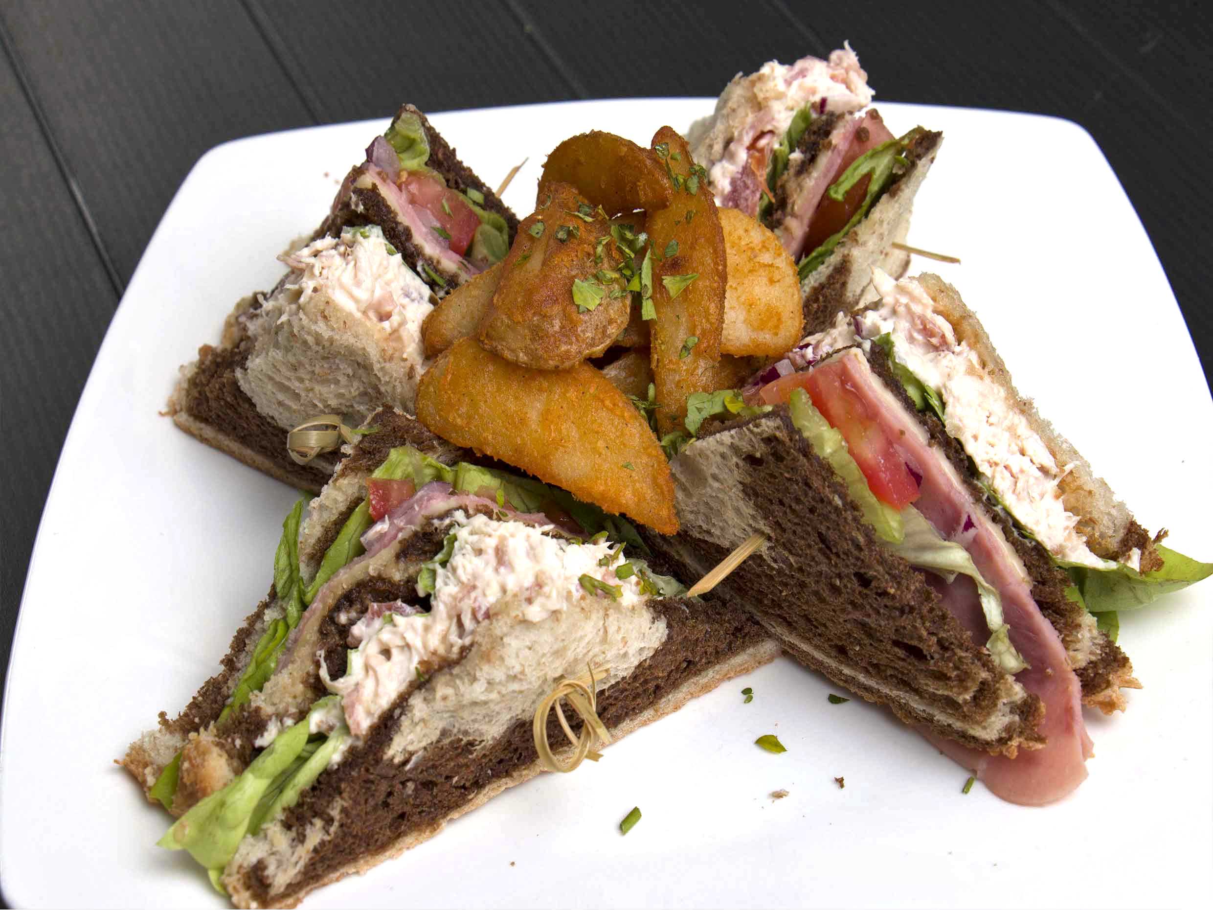 Pan de caja, relleno de pollo, jamón de pavo, lechuga, jitomate, tocino, queso manchego y aderezo, acompañado de papas gajo.
