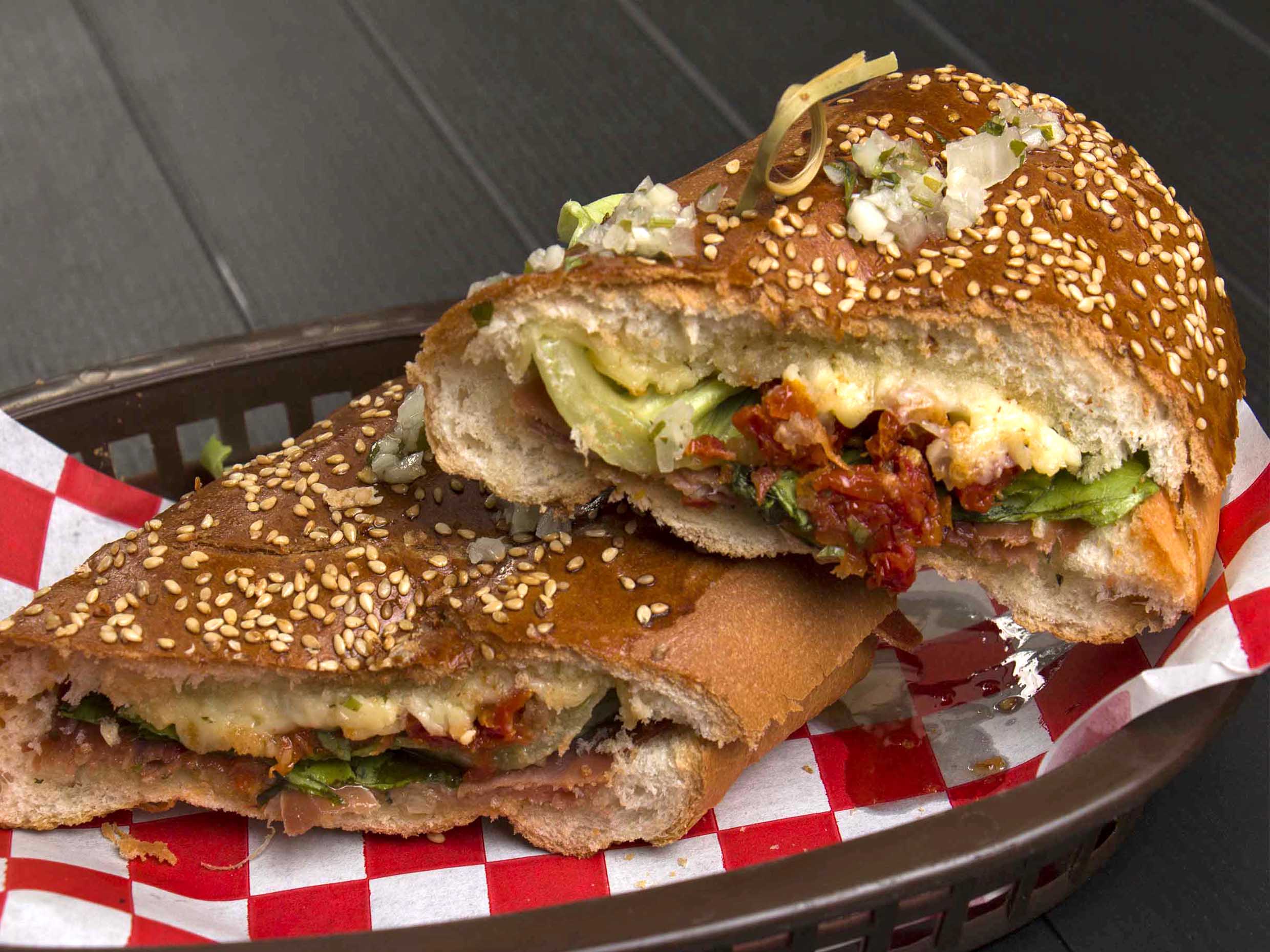 Baguette de jamón serrano, manchego, jitomate deshidratado, lechuga y oliva.
