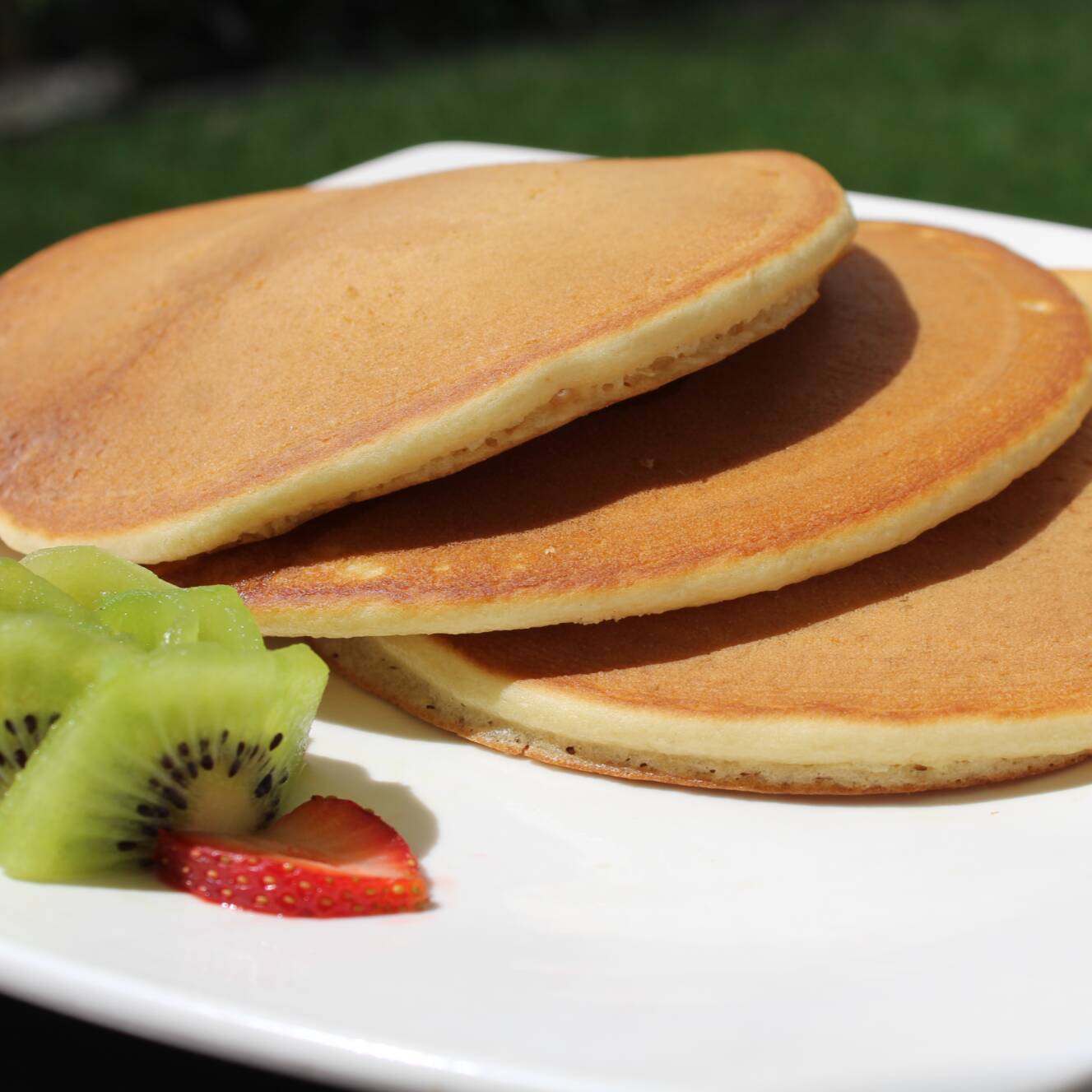 Esponjosos hot cakes acompañados de fruta fresca y jarabes.
