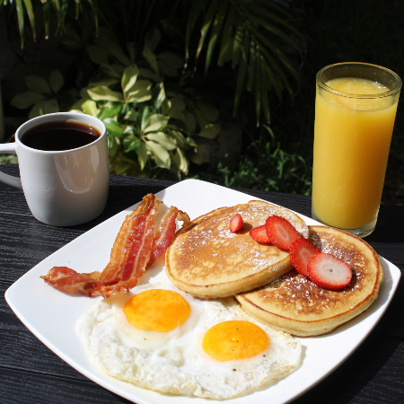 2 huevos estrellados con tocino y 1 hot cake, jugo de naranja y café americano.