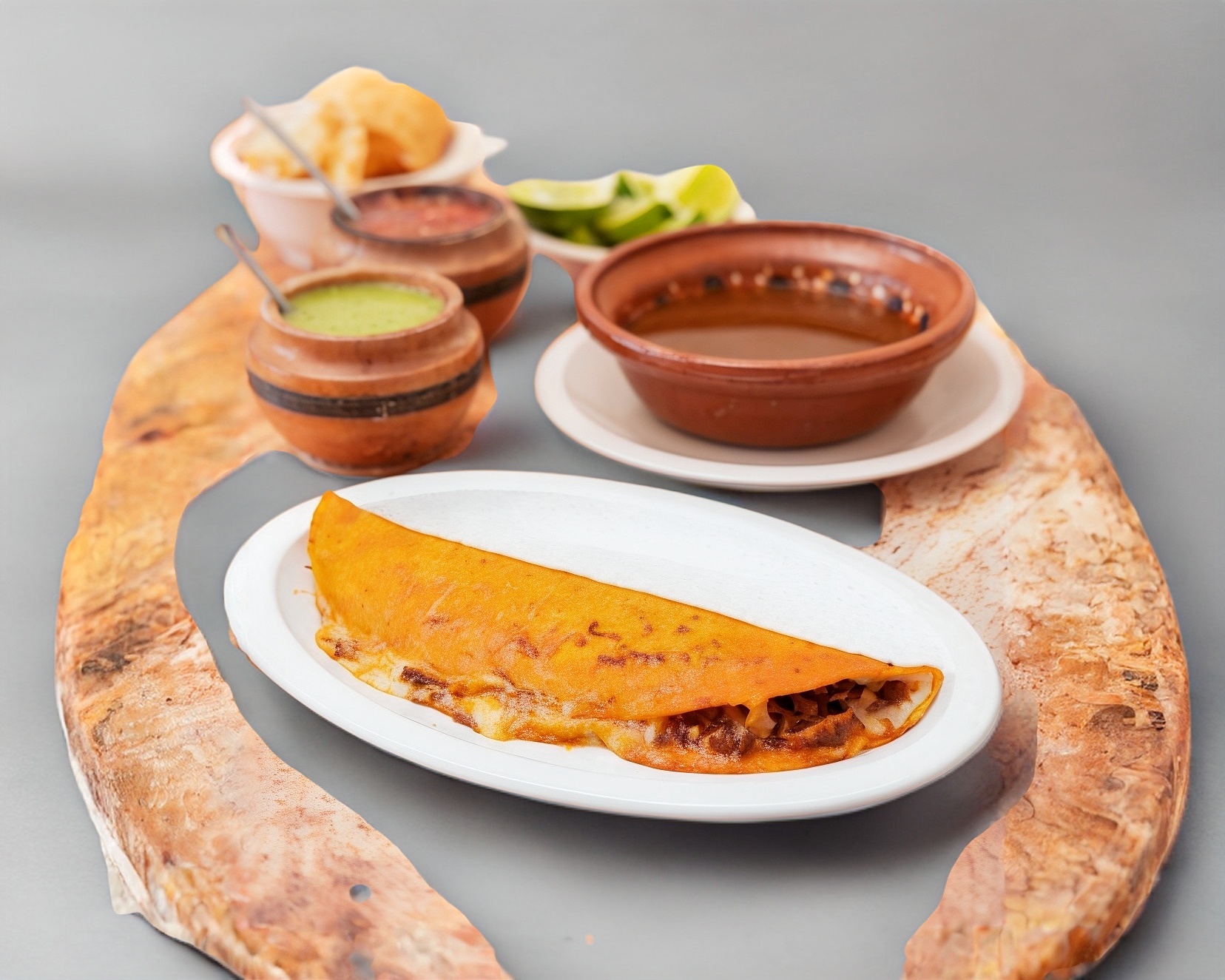 Tortilla dorada y gruesa elaborado a base de maíz y trigo con relleno de chicharrón prensado.