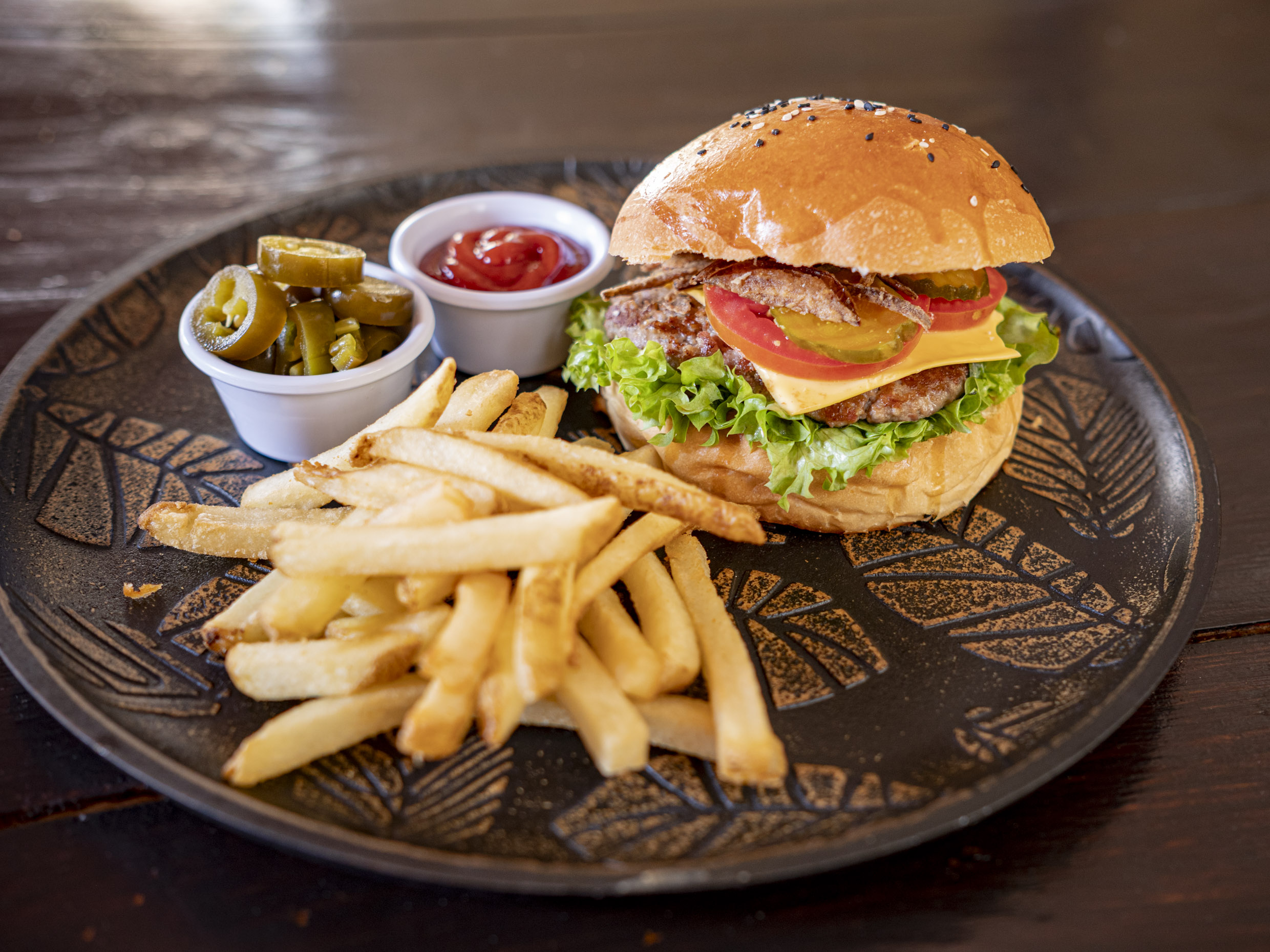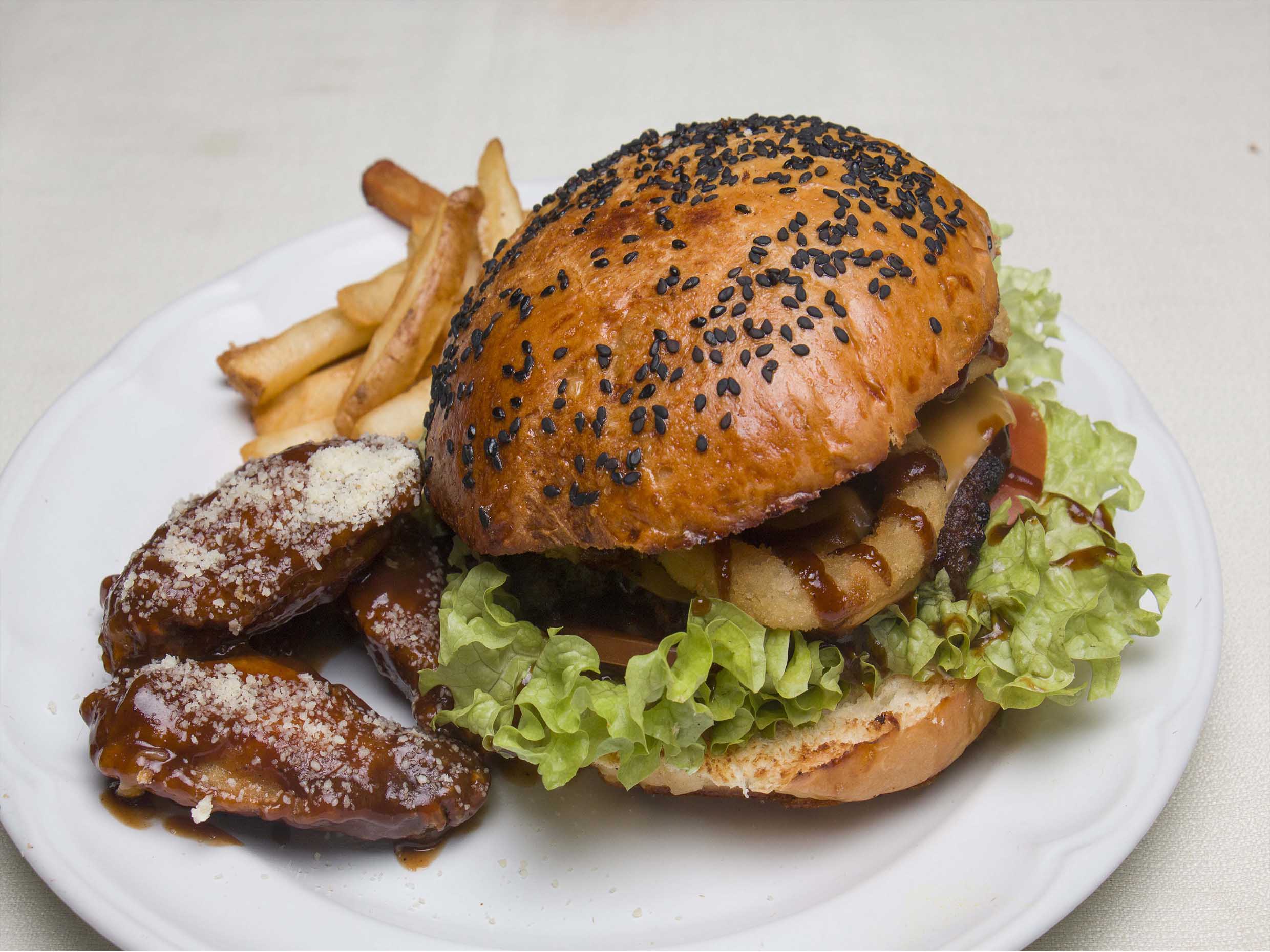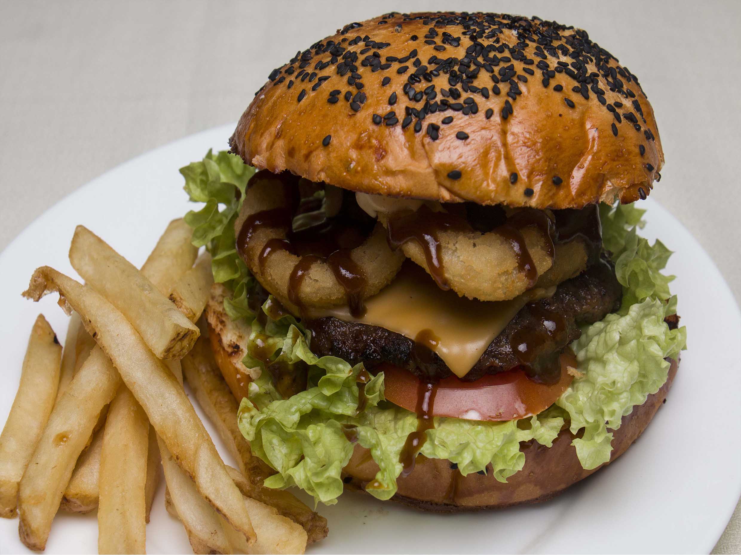 delciosa hamburguesa con pan brioche recien horneado Carne casera 100 % de res, con aros de cebolla, aderezo bbq, lechuga hidropónica, tomate, pepinillos y queso americano, acompañada de papas a la francesa.