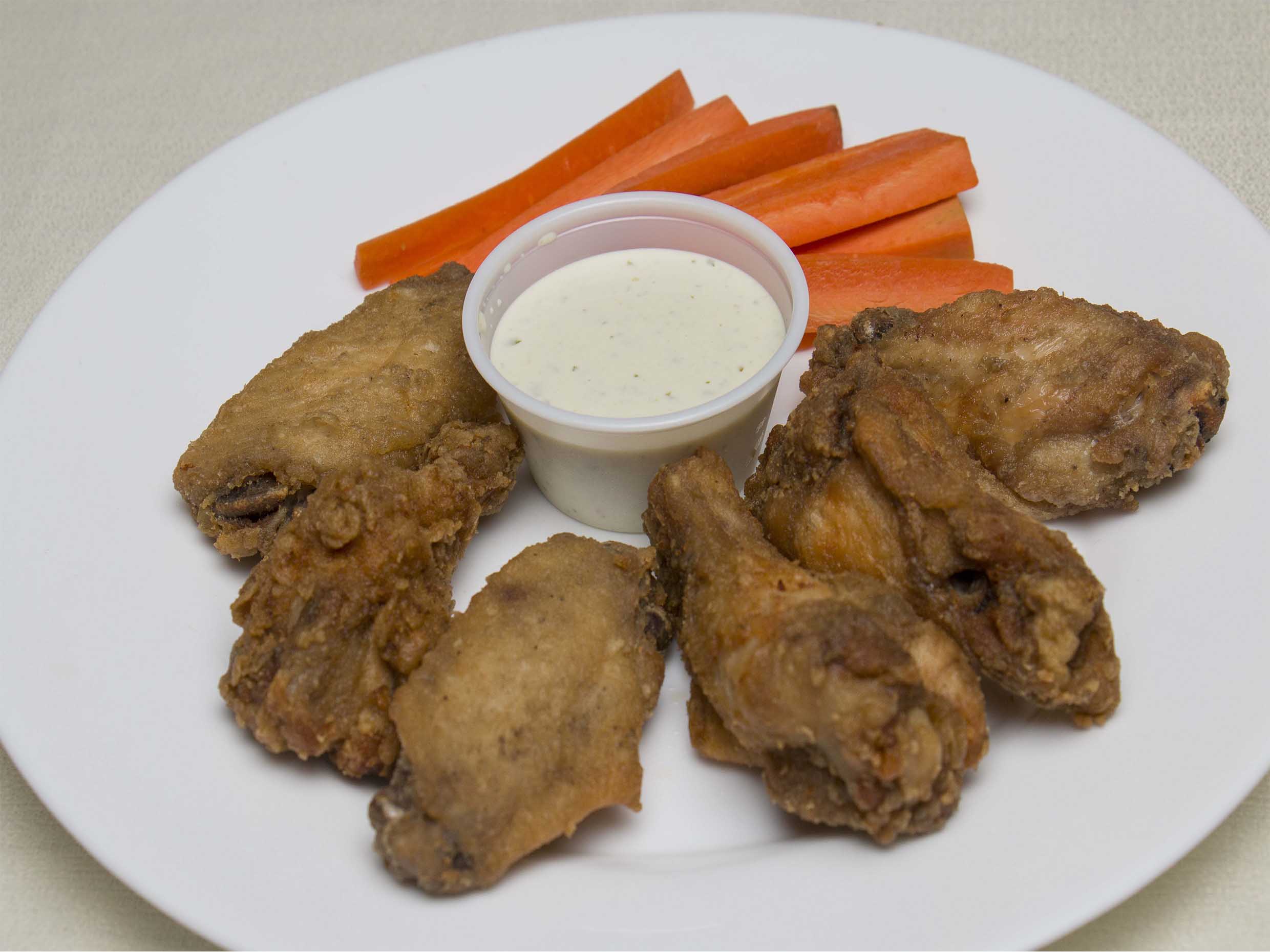 24 alitas crujientes bañadas en la salsa de su preferencia, acompañadas de vegetales y aderezo ranch.