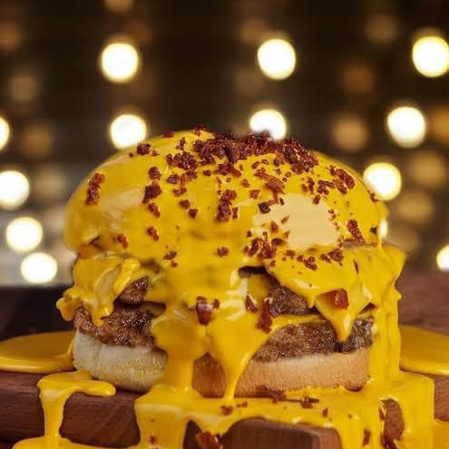 delciosa hamburguesa con pan recien horneado, doble carne casera, queso americano, bañada en queso cheedar y trozos de tocino, acompañada de papas a la francesa