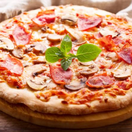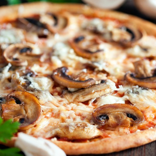 deliciosa pizza, salsa de tomate, mozzarella y champiñones.