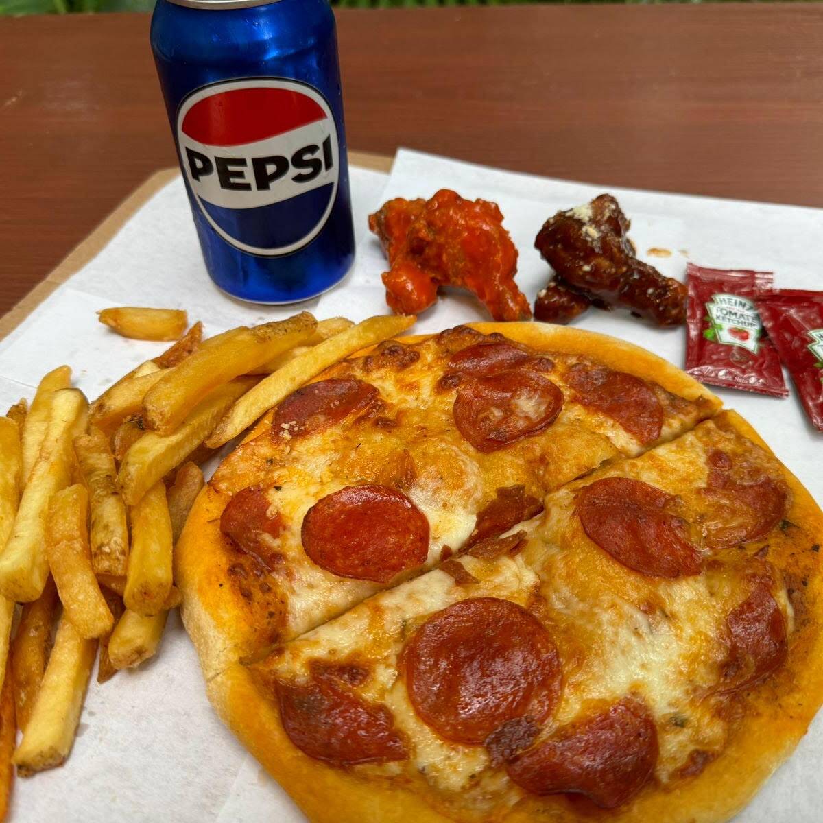 1 pizza individual (margarita o peperoni) 4 alitas sabor a elegir 1 orden de papas y 1 pepsi