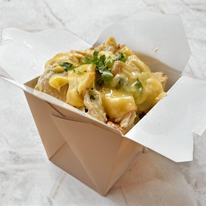 Chilakiles gratinados de salsa verde cremosa con pollo y huevo. Crema, queso, cebolla y cilantro /650 gr