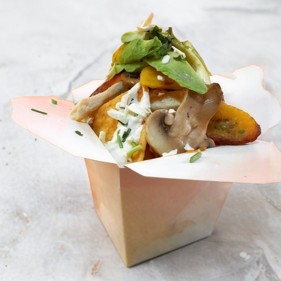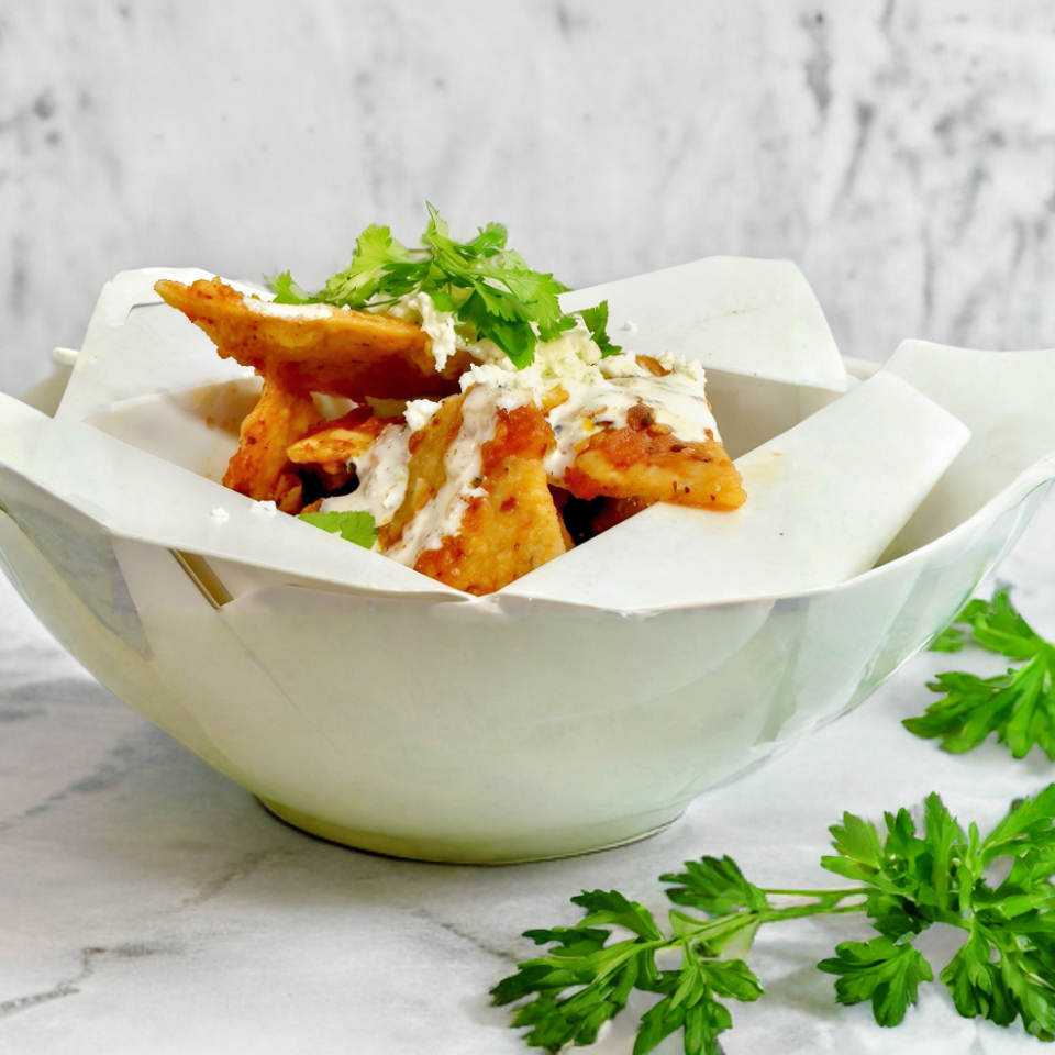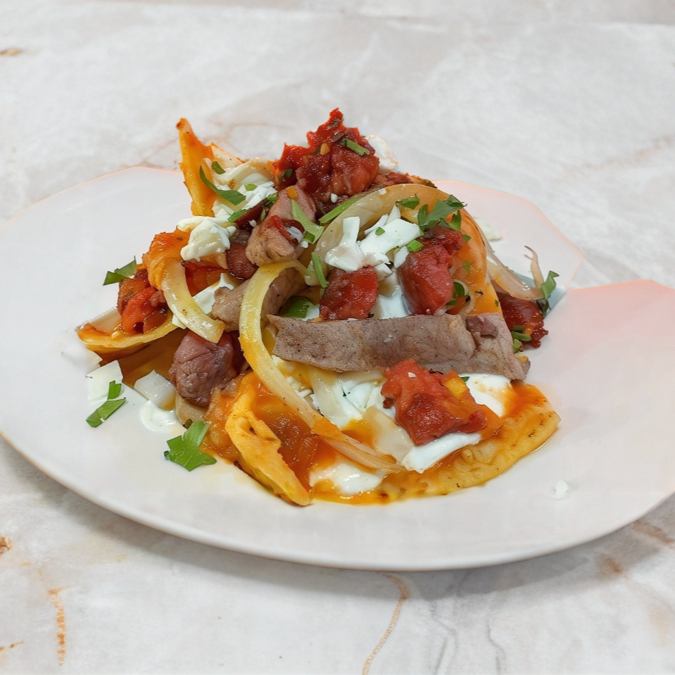 Totopos finamente dorados con tu salsa favorita y la proteína que se te antoje. Se preparan con queso fresco, crema, cebolla y cilantro. 128.00