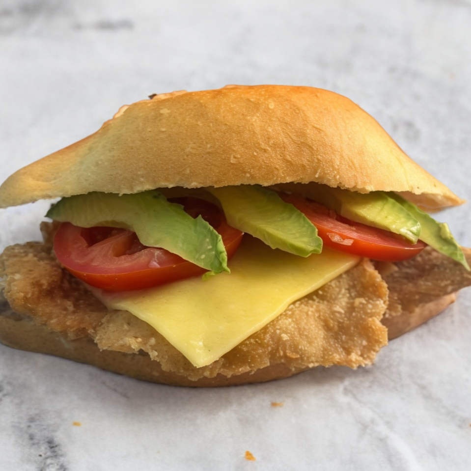 Crujiente milanesa con queso manchego, aguacate, jitomaye y cebolla. Al pan le ponemos mayonesa y frijoles.