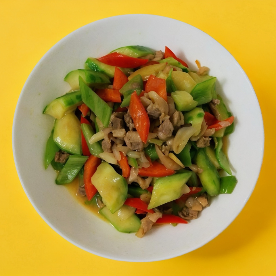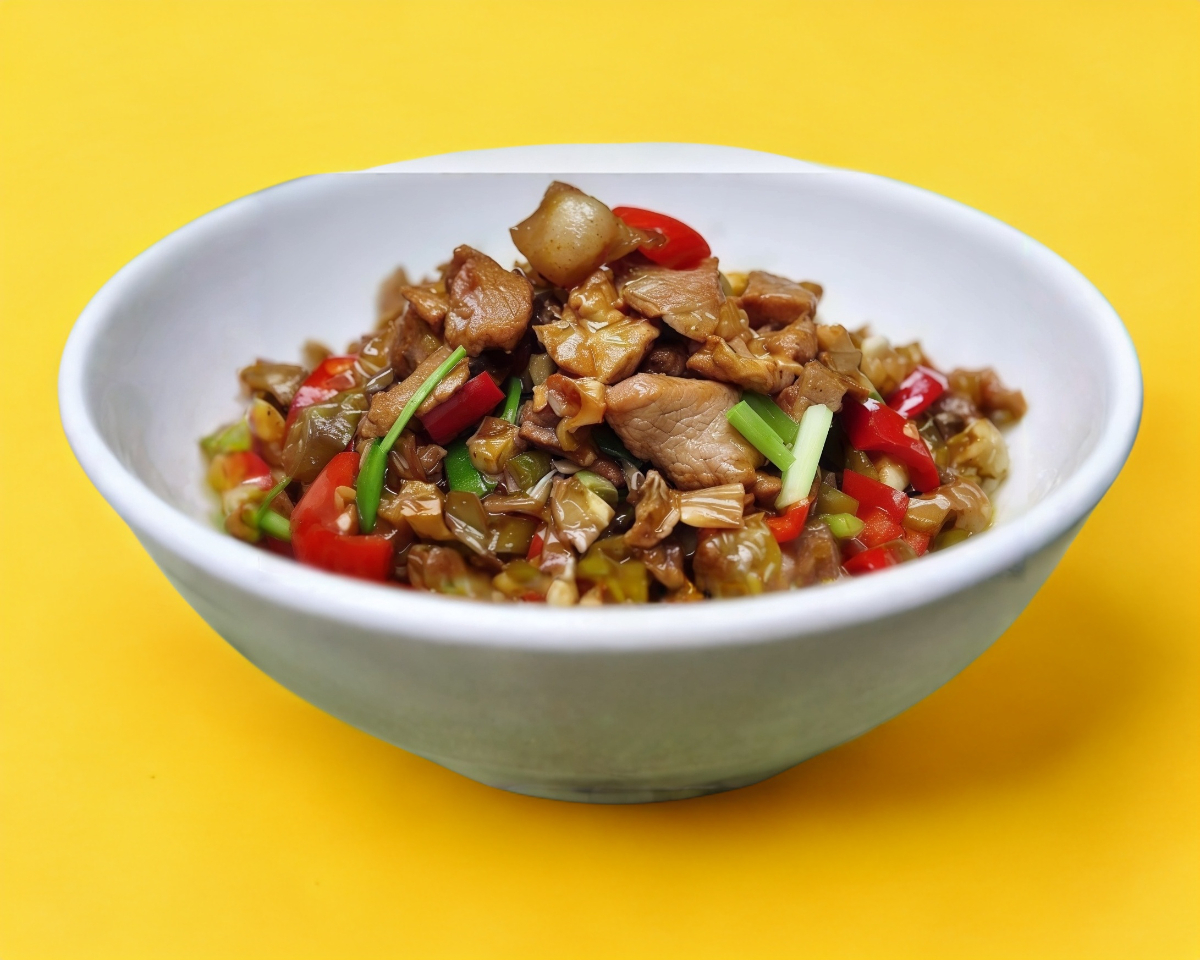 Jugoso cerdo salteado en wok con una salsa picante casera que resalta su sabor, perfecto para los amantes de las emociones fuertes.