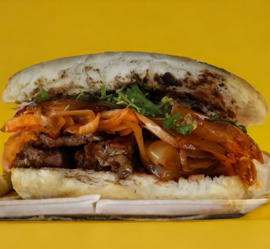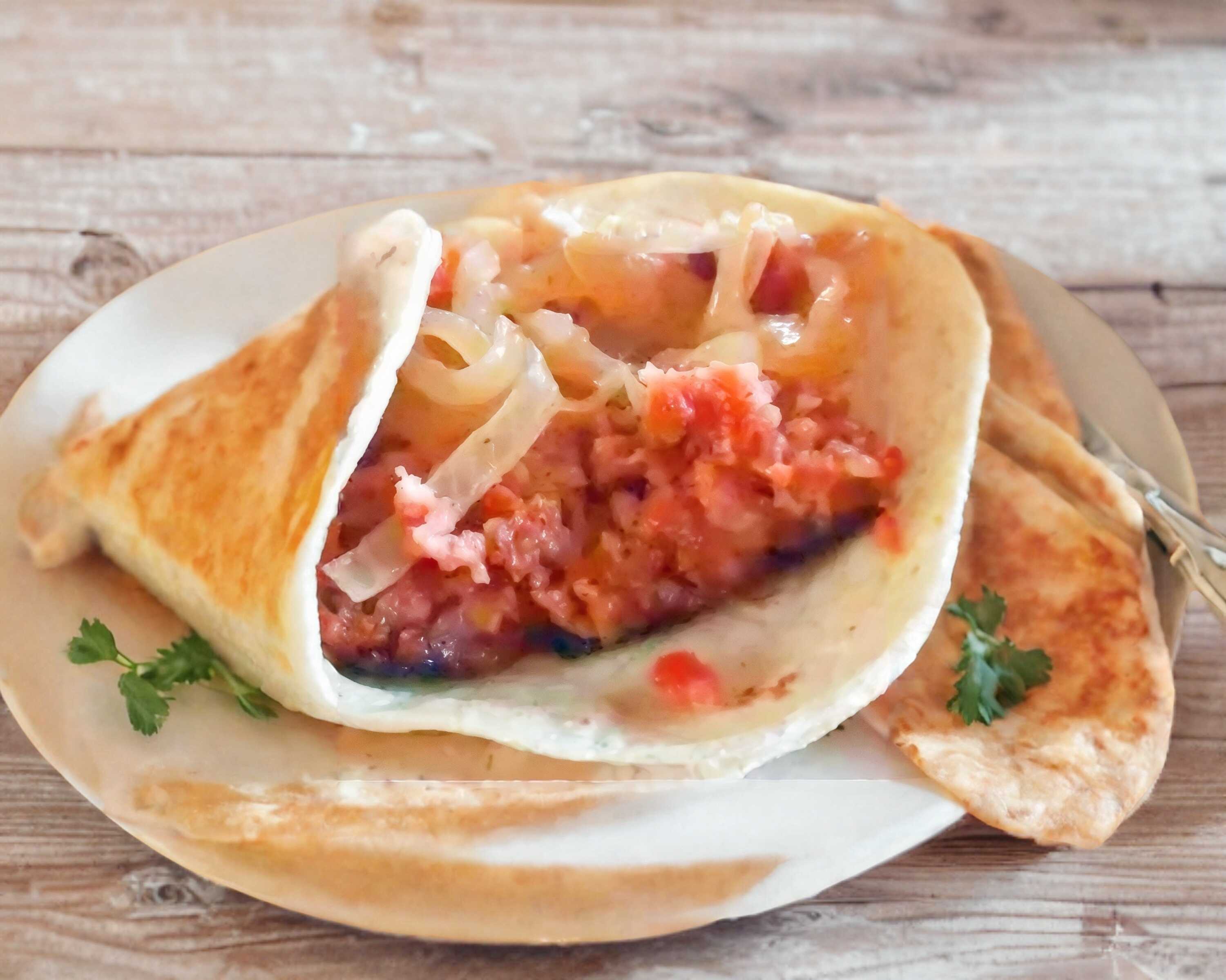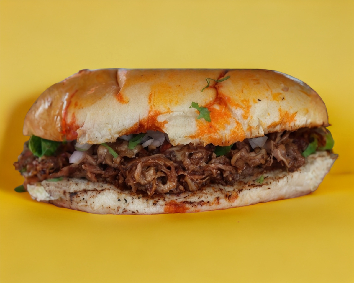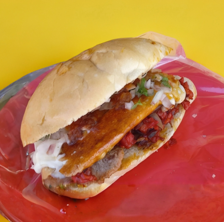 Torta campechana de asada de cerdo y longaniza, servida con cebollita asada.