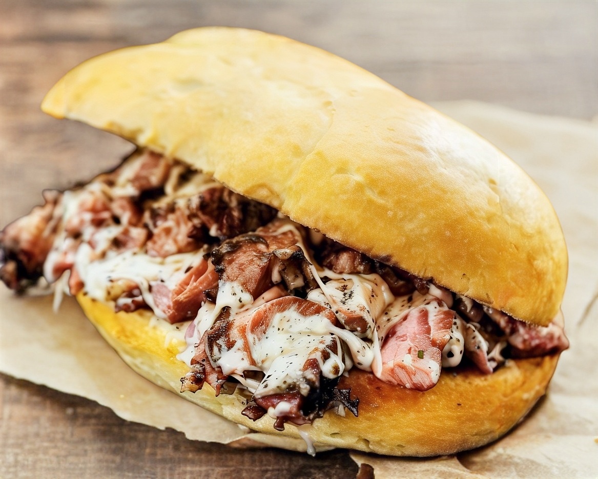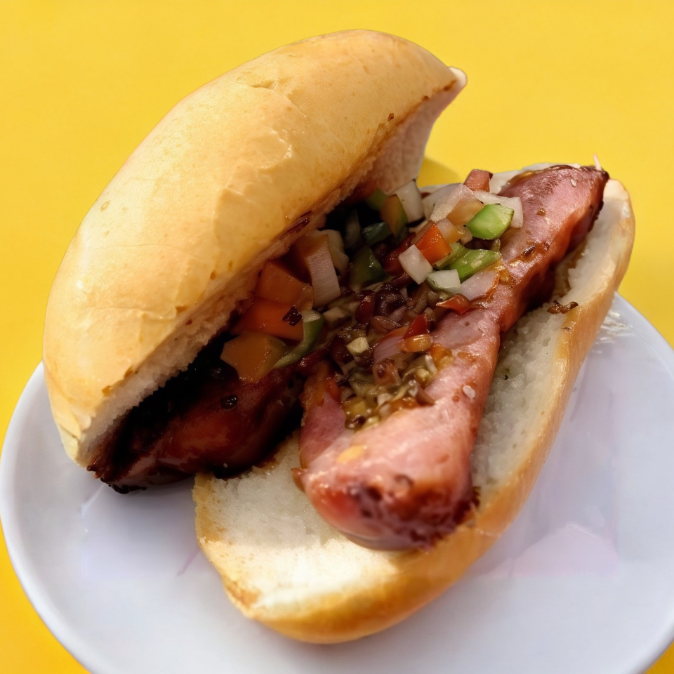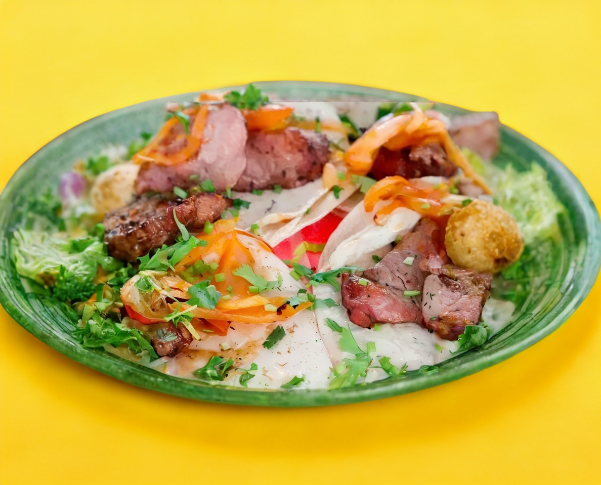 Torta campechana de asada de cerdo y longaniza, servida con cebollita asada.