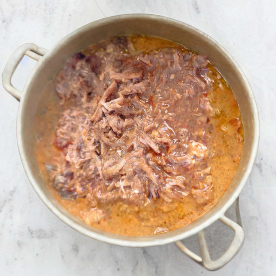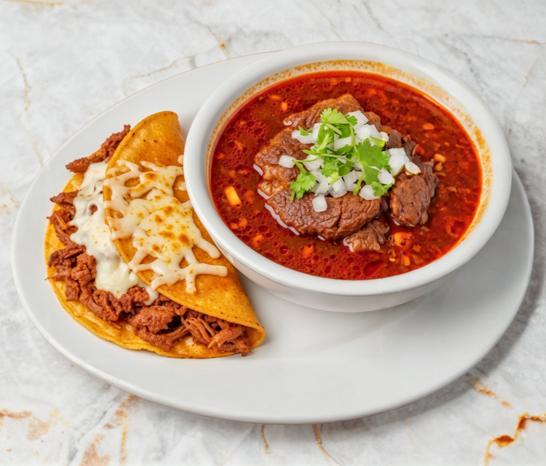 Consomé de birria res con carne y tortillas.