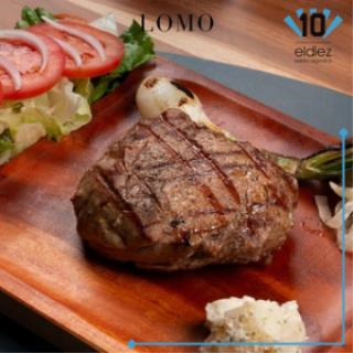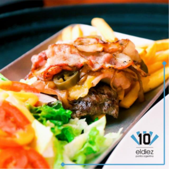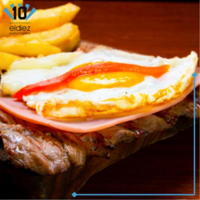 Al carbón. Con guarnición de papas a la francesa y ensalada mixta. Con jamón, pimiento morrón y huevo estrellado. 150 gramos.