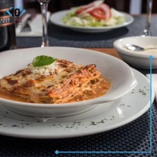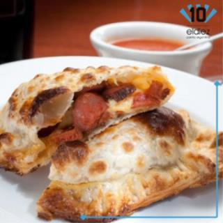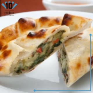 Empanada al horno rellena de espinacas con salsa bechamel, huevos, queso parmesano, pimiento rojo y cebolla.