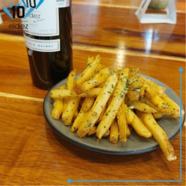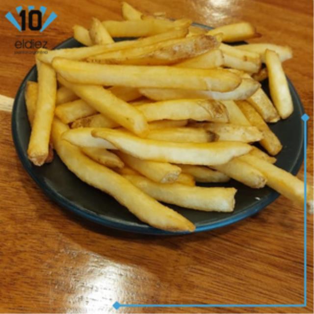 Baguette de arrachera el diez con tocino, queso, cebolla preparada, lechuga, jitomate y guarnición de papas a la francesa.