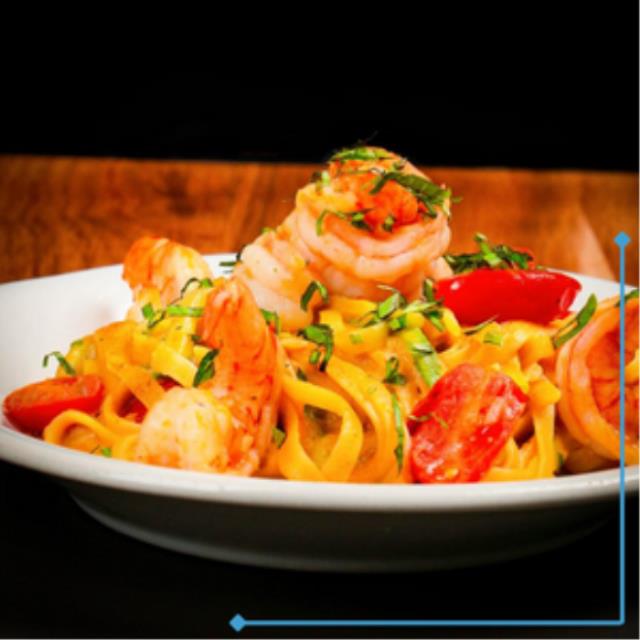 Pasta de linguini con camarones, calabacitas, vino blanco y toque de albahaca.
