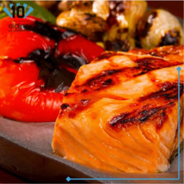 Salmón rosado a las brasas con guarnición de papas cambray al romero o verduras a la parrilla o ensalada.