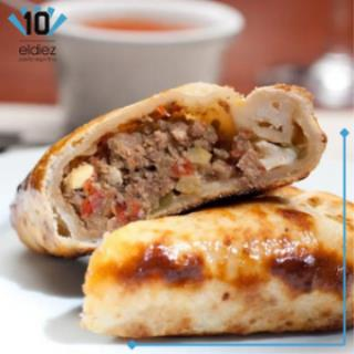 empanada frita rellena de carne, aceitunas verdes, pimiento rojo, huevos, un toque finas hierbas.