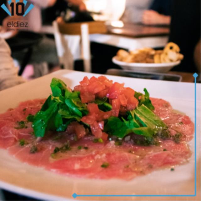 Atún fresco en láminas de cebollín, alcaparras, limón y aceite de oliva.