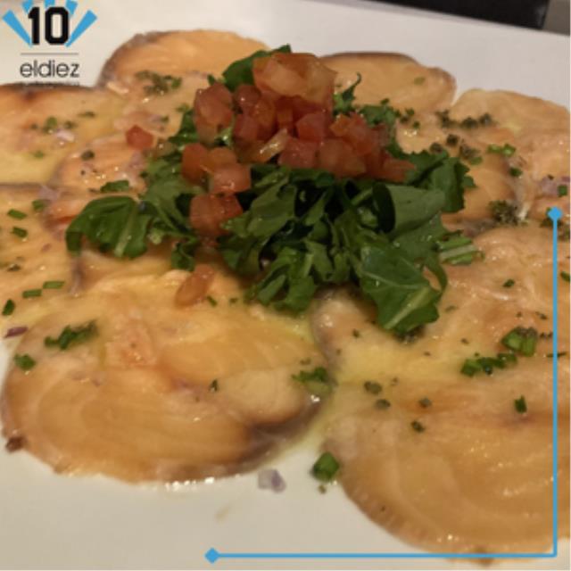 Salmón fresco en láminas de cebollín, alcaparras, limón y aceite de oliva.