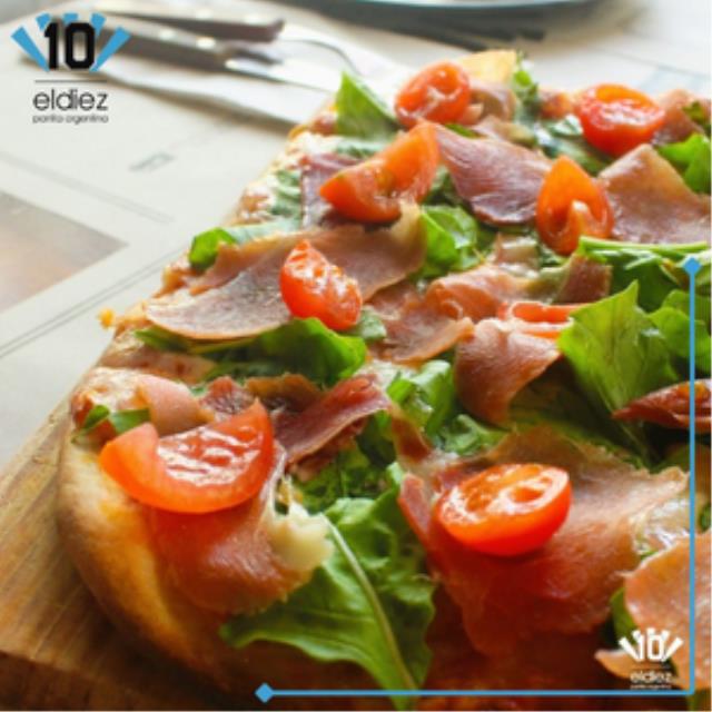 Salsa de tomate, queso mozzarella, prosciuto, rúcula y jitomate cherry.