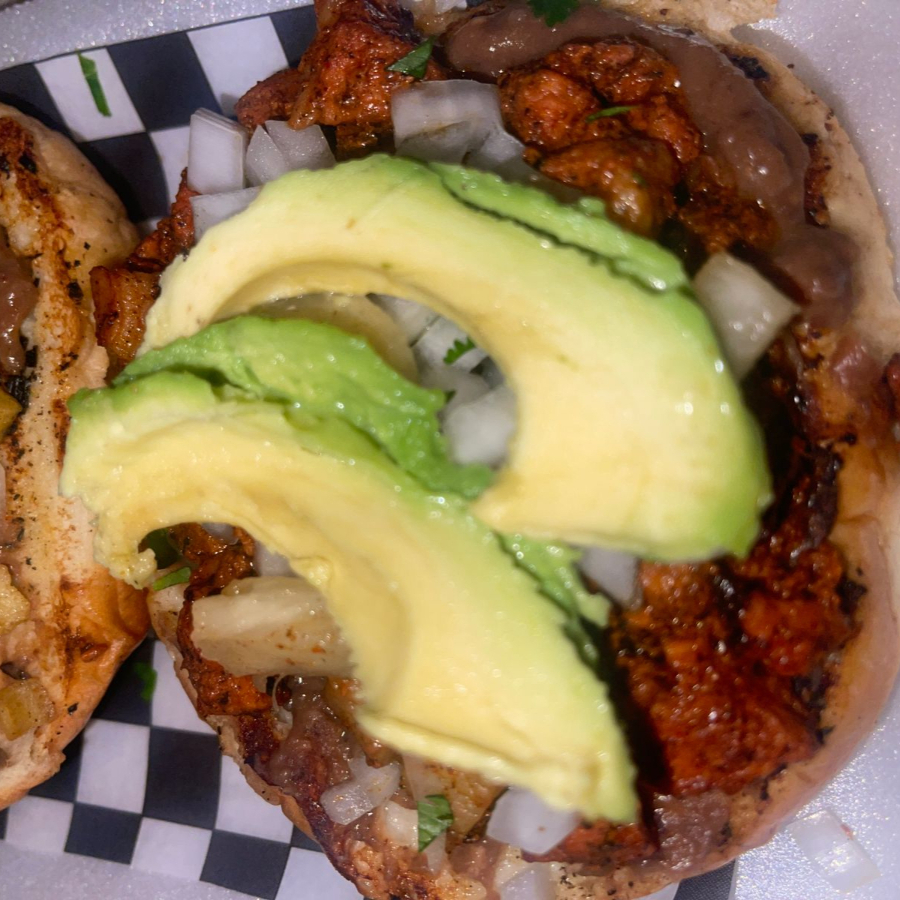 Telera especial con aderezo de la casa, carne estilo pastor, cebolla, cilantro, frijol refrito y aguacate