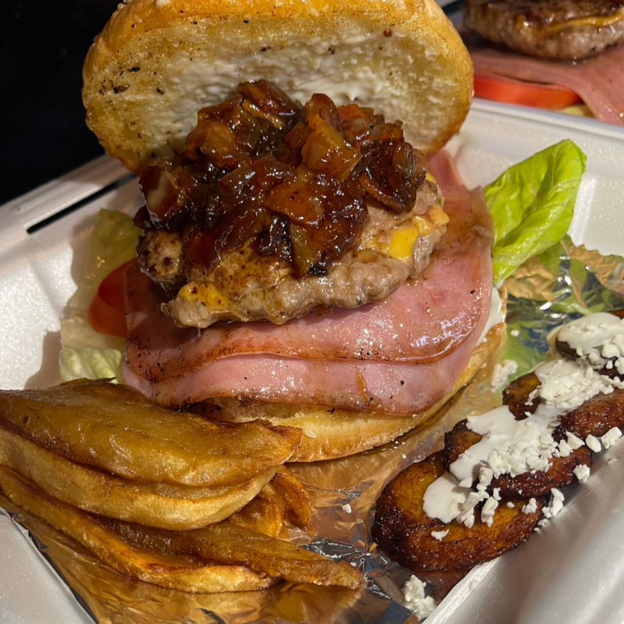 Pan brioche, doble carne rellena de queso cheddar, lechuga, tomate, doble jamón con queso gratinado y coronada con una mermelada de tocino, acompañadas con papas gajo al cajún