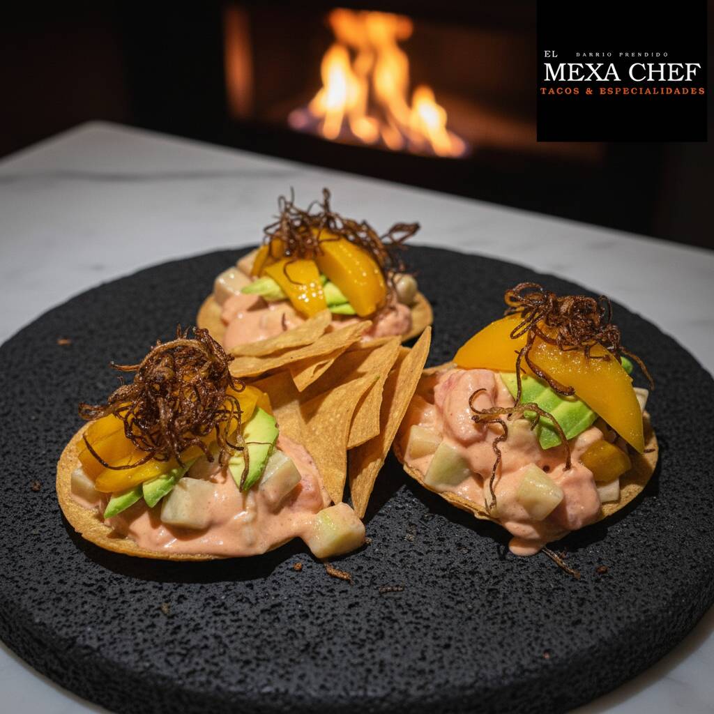 Atún fresco con pepino, marinados con aderezo agridulce picante de la casa sobre una tostada, coronada con aguacate, mango y fritura de cebolla