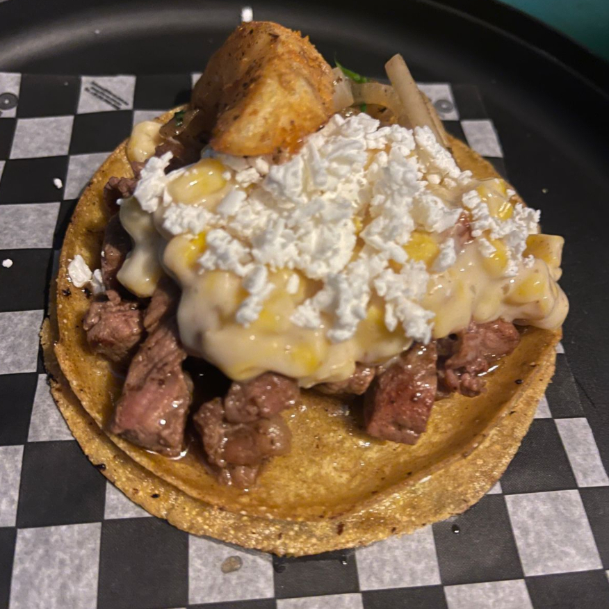 Taco Rib eye original + esquite tradicional: elote, aderezo y queso (Convierte cualquiera de los tacos orginales a Tacoesquites por tan solo $5 pesos más)