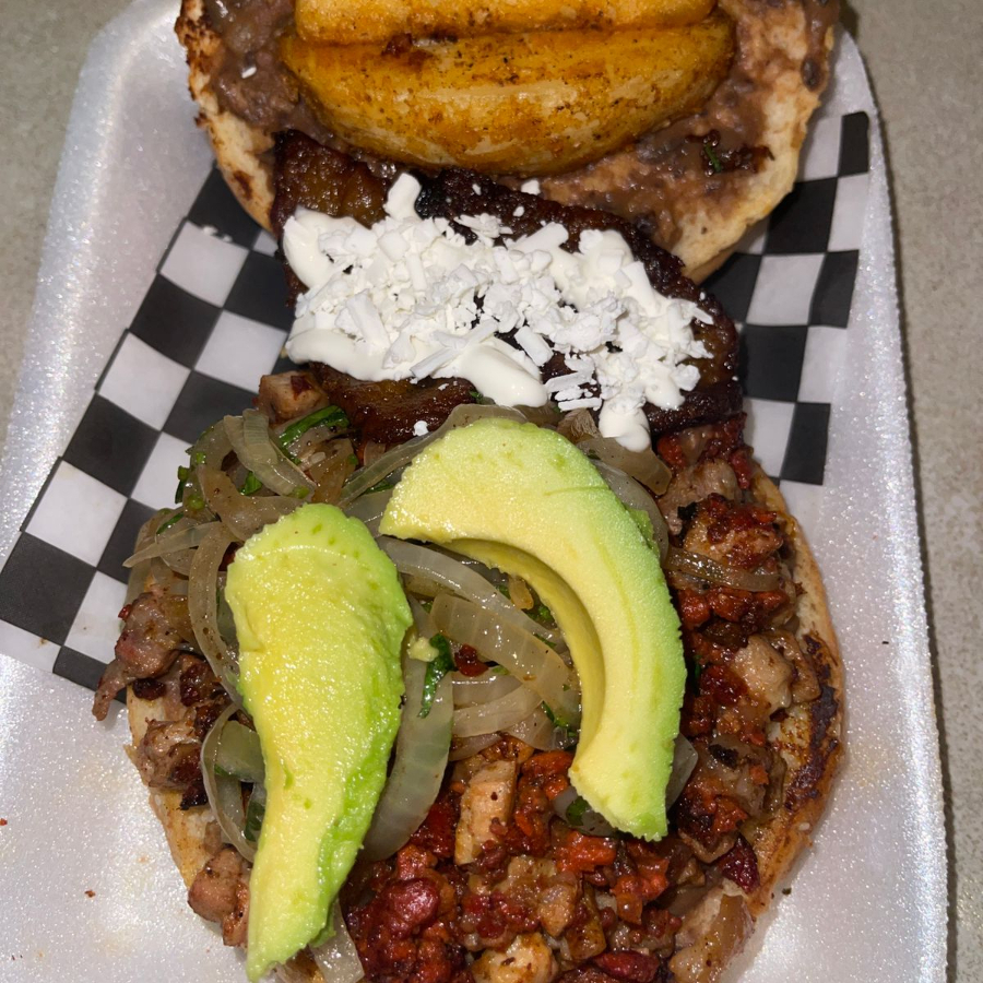 Telera especial con aderezo de la casa, pierna de cerdo, chorizo, cebolla asada, cilantro, frijol refrito y aguacate