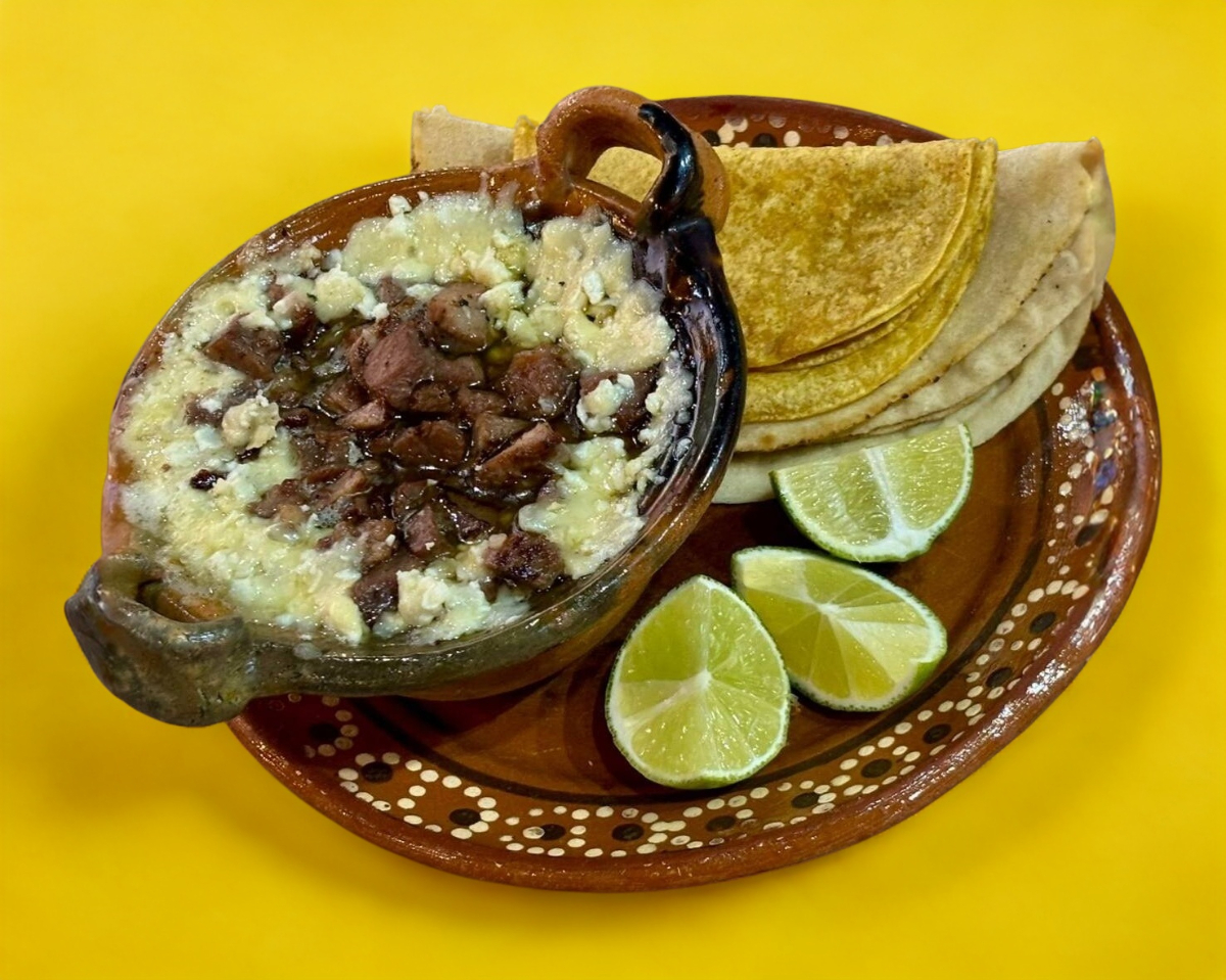 Queso fundido acompañado de carne de sirloin. Incluye 2 pan árabe y dos tortillas dobles de maíz y salsas a elegir